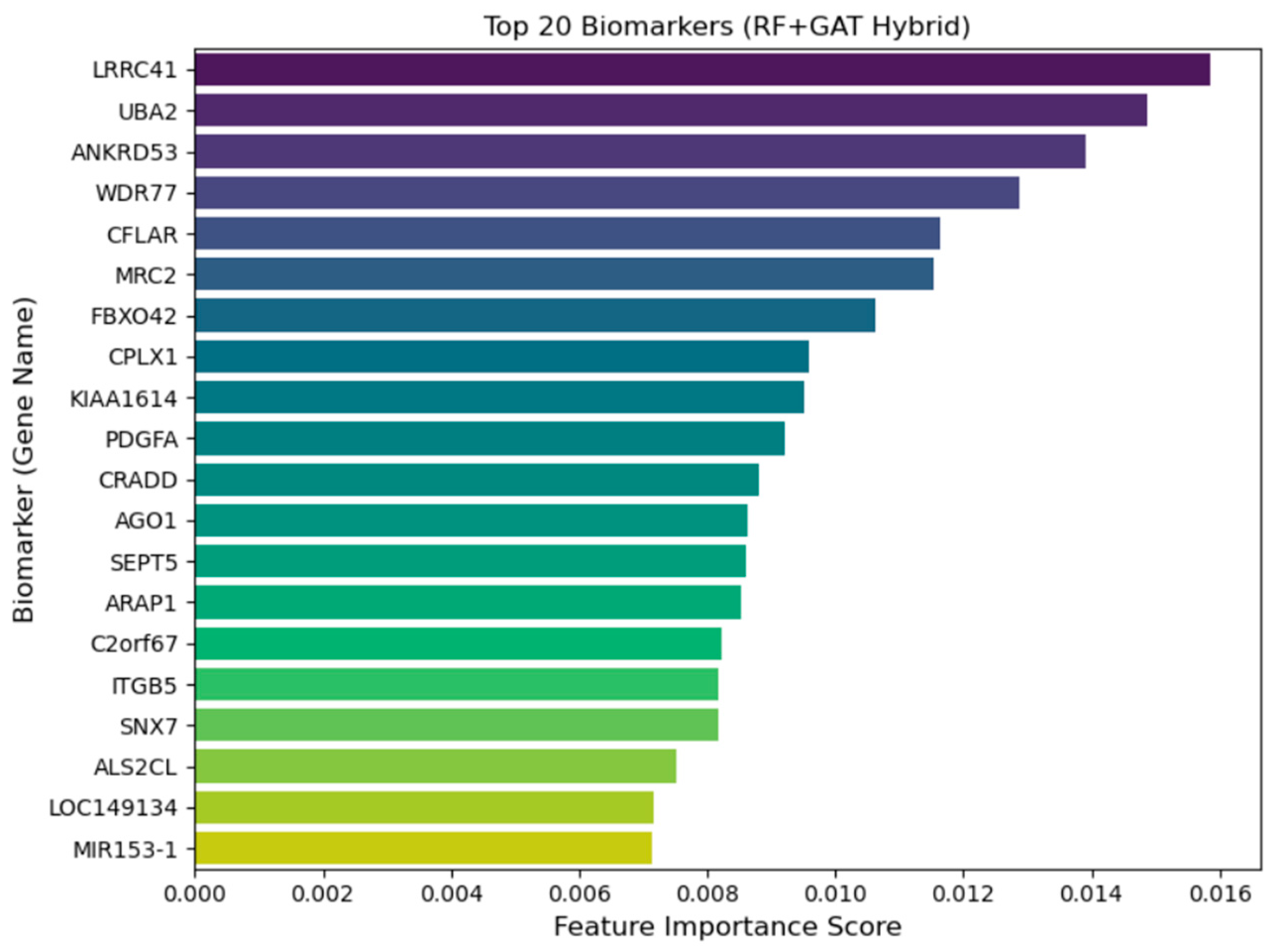 The hybrid score of the RF and GAT components indicates the complementary action of local feature selection and graph-based relational learning. RF can capture the statistical value of individual features, whereas GAT is able to model inter-gene relationships based on the attention mechanisms dictated by the protein–protein interaction (PPI) network. This shows that the hybrid approach improves the interpretability and biological relevance of features by determining biomarkers that are topologically central in the molecular interaction space.