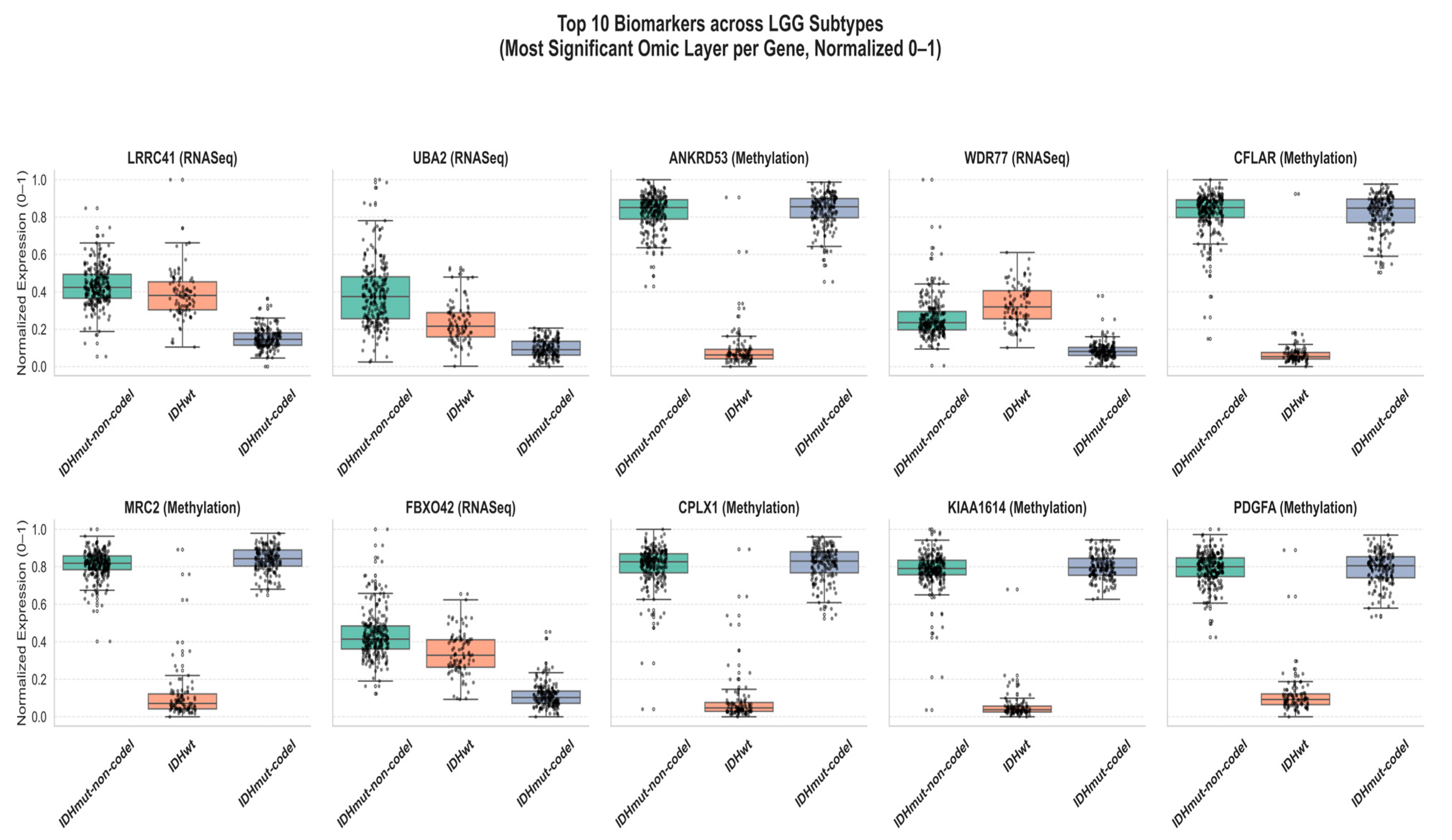 p-value. All the values were minmax normalized to 0–1 to be compared across various omic modalities. The results indicate distinct patterns of subtype-specific gene expression and DNA methylation, with relatively limited molecular variability observed within the LGG subgroups. The biomarkers (RNASeq-derived) LRRC41, UBA2, and WDR77 are more expressed in IDHmut-non-codel compared to IDHwt, suggesting that such molecules can be part of the tumor development through transcriptional enhancing mechanisms. On the other hand, the biomarkers exhibiting stronger gain of IDHwt methylation enhancements (ANKRD53, CFLAR, MRC2, CPLX1, KIAA1614, and PDGFA) hint to the fact that more aggressive tumors experience epigenetic silencing. As a rule, IDHwt samples have the minimum normalized values, which indicate either repression or hypermethylation of genes and are associated with poor prognosis. Taken together, the figure shows that the combination of multi-omics data helps improve the capacity to differentiate LGG subtypes and illustrates the complementary role of transcriptomic and epigenetic data in defining the heterogeneity of glioma and identifying possible diagnostic and prognostic biomarkers. The absence of miRNA-derived biomarkers in the top-ranked features indicates that miRNA patterns of expression have a more indirect effect on subtype differentiation, and mRNA and DNA methylation may be the predominant molecular signatures that determine the biological diversification in LGG subtypes.