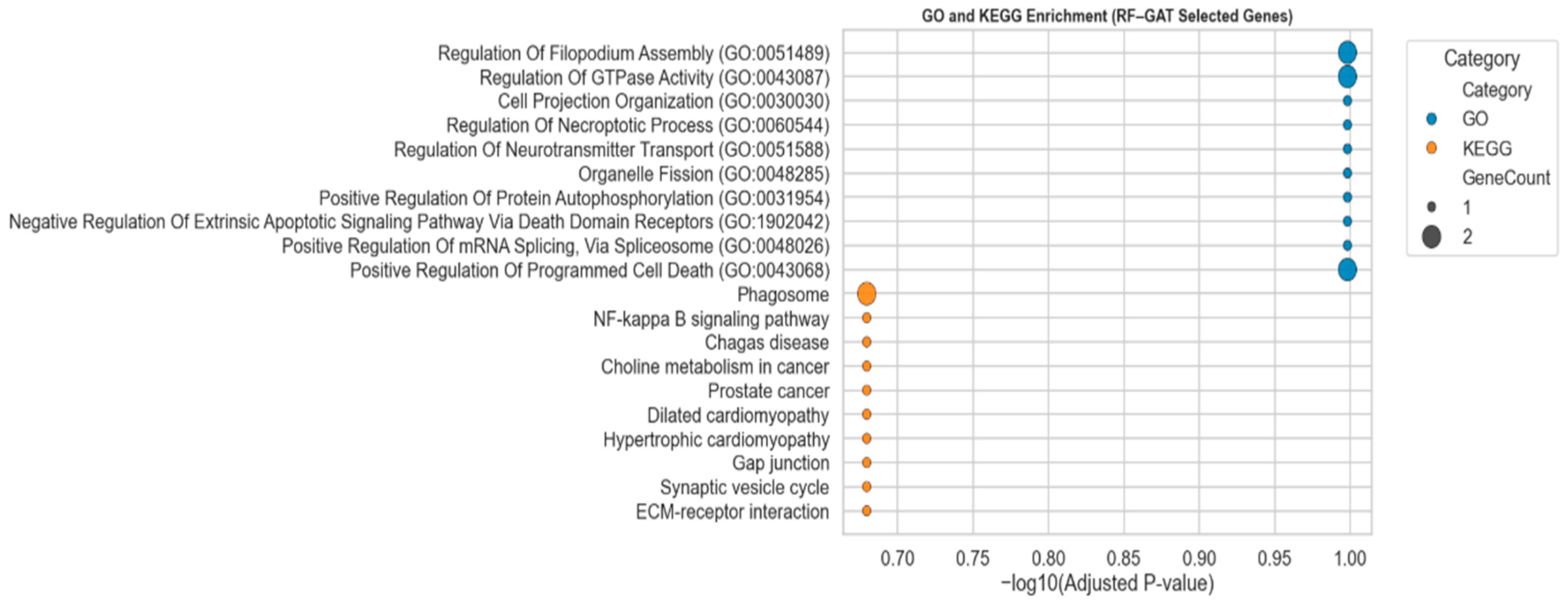 p > 0.05), although the functional enrichment results revealed biologically coherent pathways associated with tumor progression and immune regulation. This can be attributed to the relatively small number of selected genes after multi-step feature selection and the conservative multiple-testing correction. Also, some of the keygens identified by the RF-GAT-based framework appear to be novel or less well-characterized and thus are not yet extensively annotated in GO or KEGG databases. This explains the non-significance of the adjusted