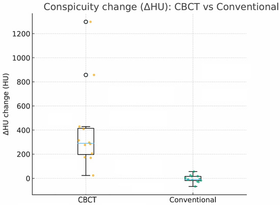 Change in lesion conspicuity (ΔHU) from preprocedural CT to intraprocedural imaging. Boxes show the interquartile range with the median line; dots represent individual patients (orange dot = CBCT group patients, green dot = conventional group patients). CBCT demonstrated higher ΔHU on distributional summaries than conventional CT in this exploratory analysis [CBCT: 290.1 HU (IQR, 197.5–414.1; n = 12); conventional: −10.5 HU (IQR, −17.9–16.5; n = 13)].