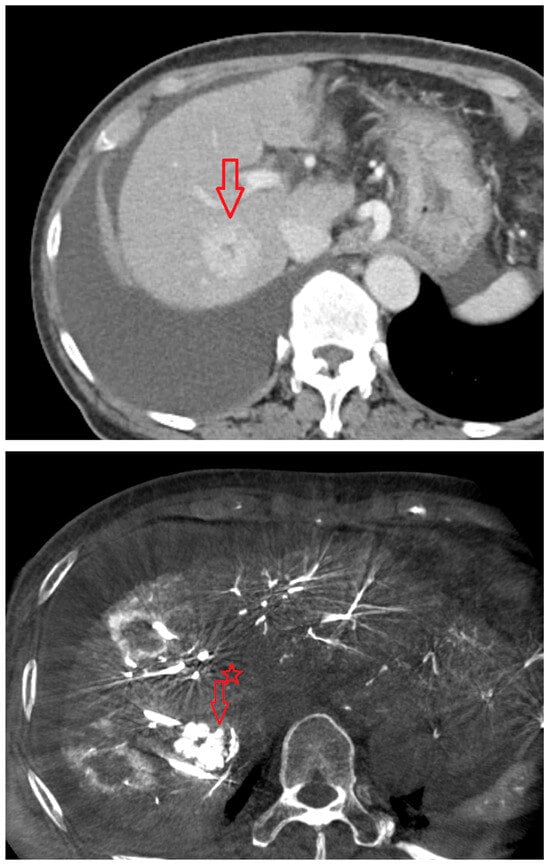 CT images from a patient with hepatocellular carcinoma undergoing angio CBCT-guided RFA. (Top): pre-procedural CT (portal venous phase; lesion 128.7 HU, red arrow = HCC mass). (Bottom): intraprocedural angio CBCT (lesion 1499.7 HU, red arrow with star = HCC mass). ΔHU = 1298.0 HU. (intra lesion − intra background) − (pre lesion − pre background).
