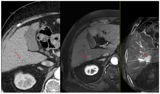 Images from another patient with hepatocellular carcinoma undergoing angio CBCT-guided RFA. All red arrows indicate the HCC mass. (Left): pre-procedural CT (portal phase). (Middle): pre-procedural MRI (arterial phase). (Right): intraprocedural angio CBCT. (Intra lesion − Intra background = 432.7 HU).