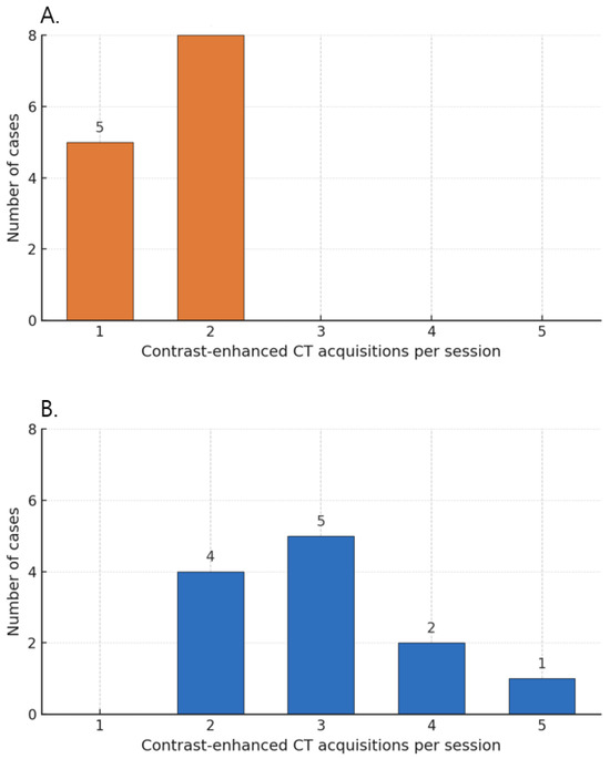 Number of contrast-enhanced CT acquisitions per session. (A) Conventional RFA group (n = 13). (B) Angio-CBCT group (n = 12). Note.—The following outlier cases were excluded from the analysis: (1) lipiodol-guided RFA after TACE, (2) cases in which only post-ablation confirmation CT was obtained, and (3) procedures performed with ultrasound guidance alone.