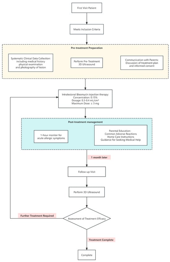 Detailed medical histories were taken and physical examinations were conducted after the children presented at the hospital. Patient age and the type, location, and growth of the lesions were recorded. Before treatment initiation, 3D-CPA was performed and the parents of the patients were informed of the treatment plan, which was conducted in an outpatient setting. Once a month, 0.3–0.4 mL/cm3 of a 0.15% bleomycin solution (Hanhui Pharmaceutical Co., Ltd., Hangzhou, Zhejiang, China) was injected into lesions, with the maximum dose not exceeding 3 mg [,]. The needle was inserted from the edge of the hemangioma and the drug solution was injected radially. It was confirmed that the withdrawal syringe was free of blood before injection. The injection was typically stopped when the skin of the hemangioma became mildly whitened. The children were reevaluated using 3D-CPA one month after the first injection (Figure 1).