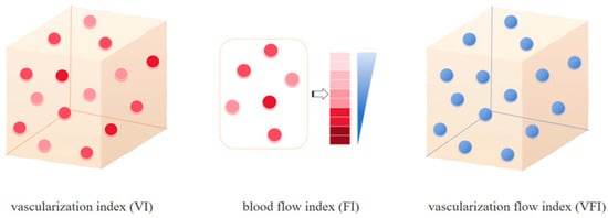 Image analysis was performed using QLAB Advanced Ultrasound Quantification (Philips). The 3D volume and blood flow parameters of each lesion were calculated. The 3D blood flow parameters VI, FI, and VFI were calculated as follows: VI = color voxels/(total voxels − background voxels), FI 1 = weighted color voxels/(color voxels − border voxels), FI 2 = weighted color voxels/color voxels, VFI 1 = weighted color voxels/(total voxels − background voxels), and VFI 2 = weighted voxels × cube volume/(cyst volume × total voxels) (Figure 2) [].