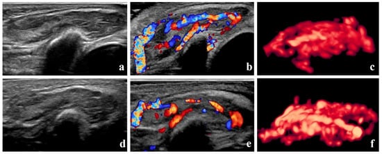 Grade I therapeutic efficacy—B-mode images, color Doppler images, and three-dimensional angiographic visualization of infantile hemangioma before and after treatment. The volume of the hemangioma was 4.2 mL before treatment and 3.9 mL one month after the initial local injection. (a–c) Before treatment, dense blood vessels can be seen in the hemangioma. The vascularization index, flow index, and vascularization–flow index were 53.5%, 44.6, and 23.9, respectively. (d–f) One month after treatment, blood vessels in the hemangioma remain dense.