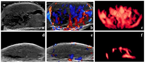 Grade IV therapeutic effect—B-mode images, color Doppler images, and three-dimensional angiographic visualization of infantile hemangioma before and after treatment. The volume of the hemangioma was 8.53 mL before treatment and 1.33 mL one month after the initial local injection. (a–c) Before treatment, dense blood vessels can be seen in the hemangioma. The vascularization index, flow index, and vascularization–flow index were 25.4%, 42.0, and 10.7, respectively. (d–f) One month after treatment, only sparse blood vessels can be seen in the hemangioma.
