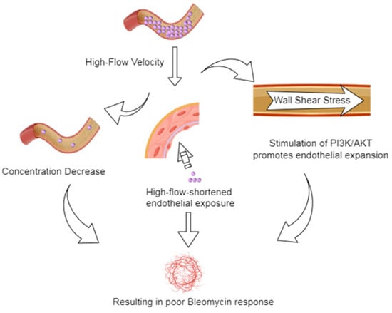 The poor response to bleomycin treatment of lesions with high blood flow parameters may probably involve multiple mechanisms (Figure 5). First, a high VI or VFI indicates that the lesion has a high vascular density and large blood flow, which may probably cause the dilution of locally injected bleomycin under a rapid blood flow washout, resulting in an early reduction in drug concentration. Second, the wall shear stress generated by the rapid blood flow corresponding to a high FI may not only shorten the drug–endothelial contact time but also activate the phosphoinositide 3-kinase/AKT signaling pathway to promote the growth of vascular endothelial cells [,] and antagonize the DNA damage caused by bleomycin. The synergistic effects of these factors may weaken the therapeutic effects of bleomycin in lesions with high blood flow. In contrast, lesions with low blood flow are more likely to respond to bleomycin treatment through the apoptosis and fibrosis of vascular endothelial cells owing to low angiogenic activity and relatively high drug concentration and residence time.