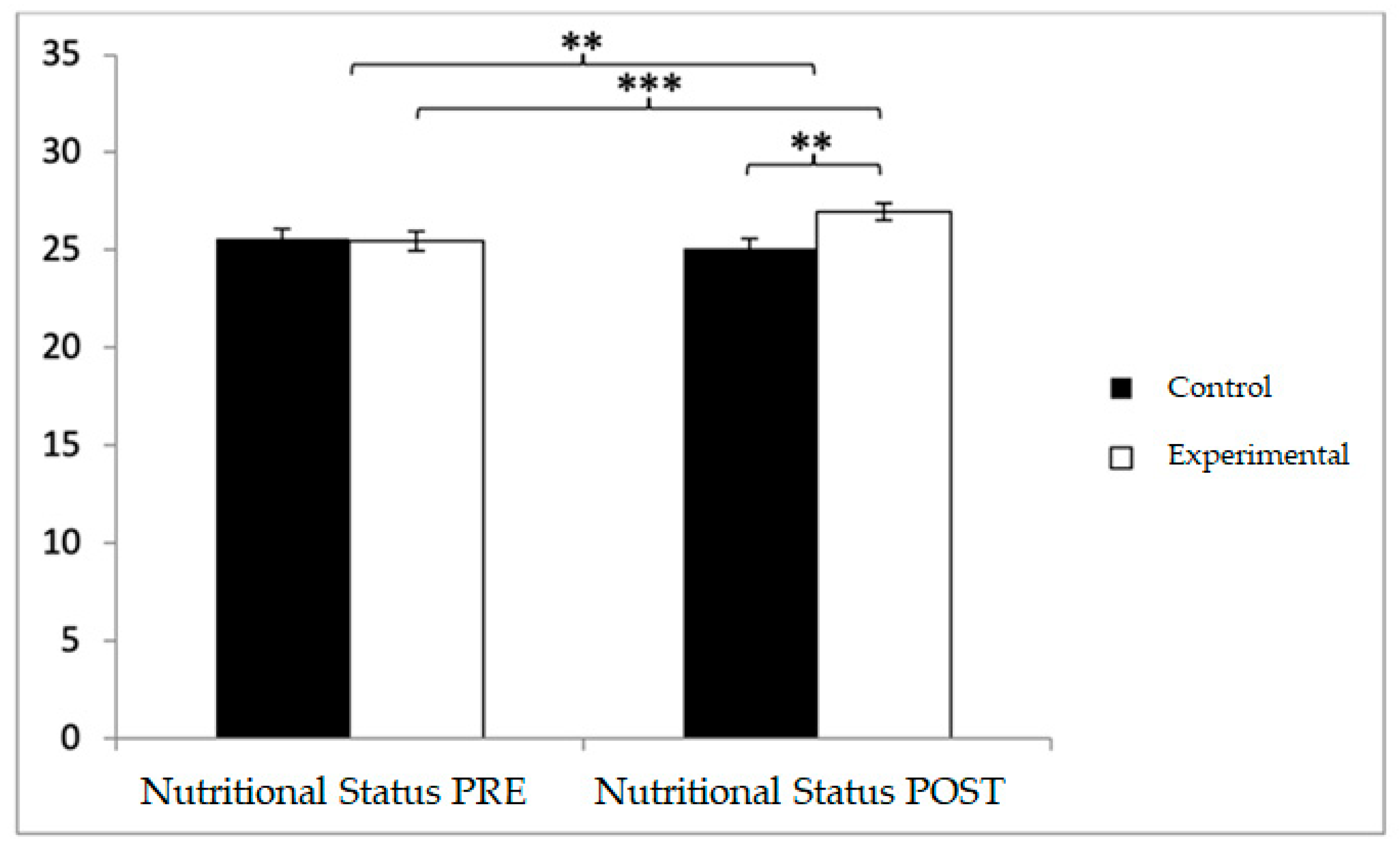 With respect to nutritional status, participants in the control group (CG) reported higher baseline values (25.56 ± 3.73) compared to those in the experimental group (EG) (25.46 ± 3.50). However, in the post-intervention assessment, higher values were observed in the EG relative to the CG (26.98 ± 3.21 vs. 25.08 ± 3.59). Significant effects were found for Group × Time: F(1,102) = 42.102,