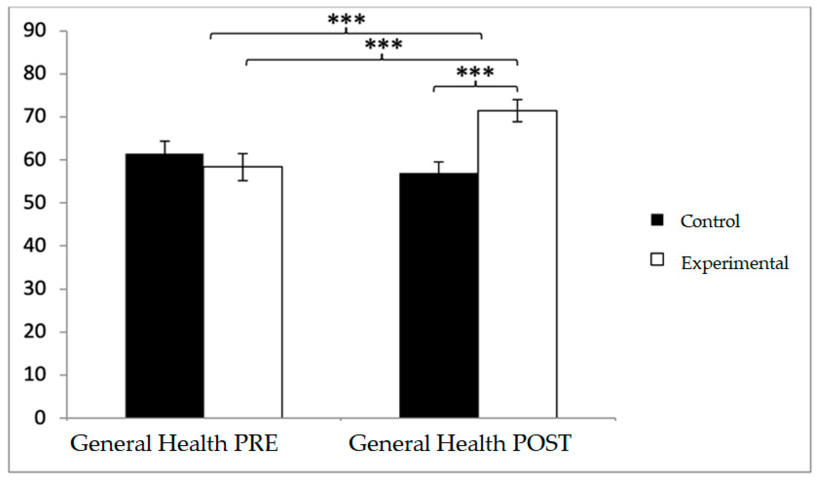 For health-related quality of life, baseline differences favored the control group in several domains, but this tendency shifted after the intervention. In general health, participants in the control group reported higher values at baseline (61.54 ± 19.74 vs. 58.37 ± 22.49), whereas post-intervention scores were greater in the experimental group (71.44 ± 18.29 vs. 57.02 ± 18.37). Significant effects emerged for Group × Time (F(1,102) = 63.551,