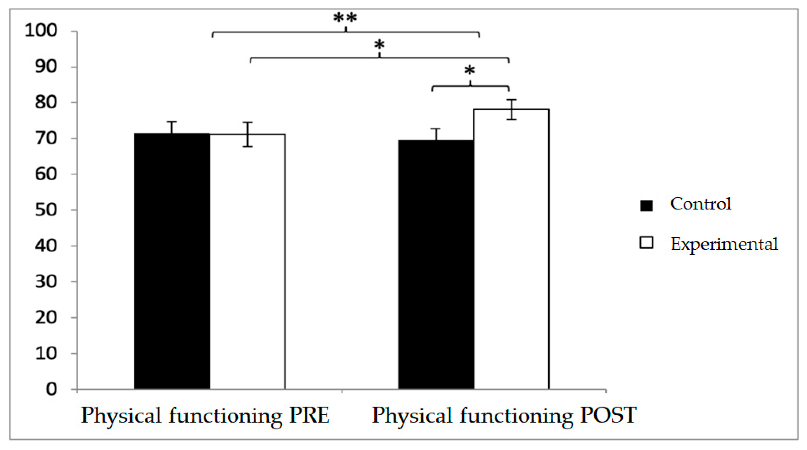 A similar pattern was observed in physical functioning. While baseline values were higher in the control group (71.44 ± 23.71 vs. 71.15 ± 24.02), post-intervention values favored the experimental group (78.08 ± 19.83 vs. 69.52 ± 22.69). Significant effects were found for Group × Time (F(1,102) = 20.217,