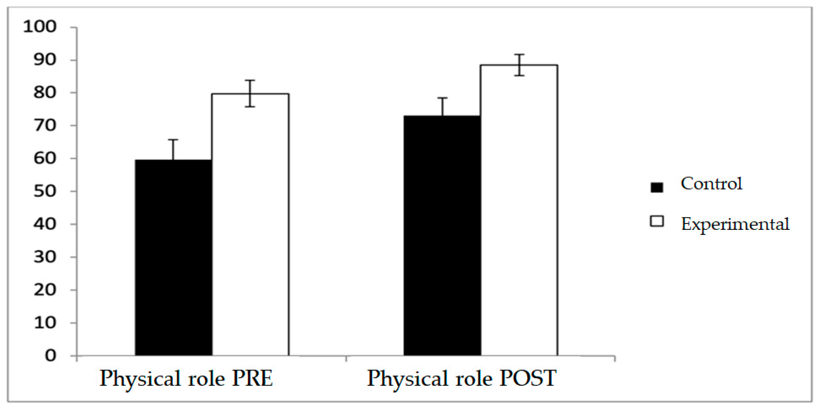 Regarding physical role, the experimental group consistently reported higher scores both before and after the intervention (79.81 ± 28.46 vs. 59.62 ± 44.32 at baseline; 88.46 ± 23.46 vs. 73.08 ± 38.93 at post-intervention) with a significant main effect for Group (F(1,102) = 9.335,