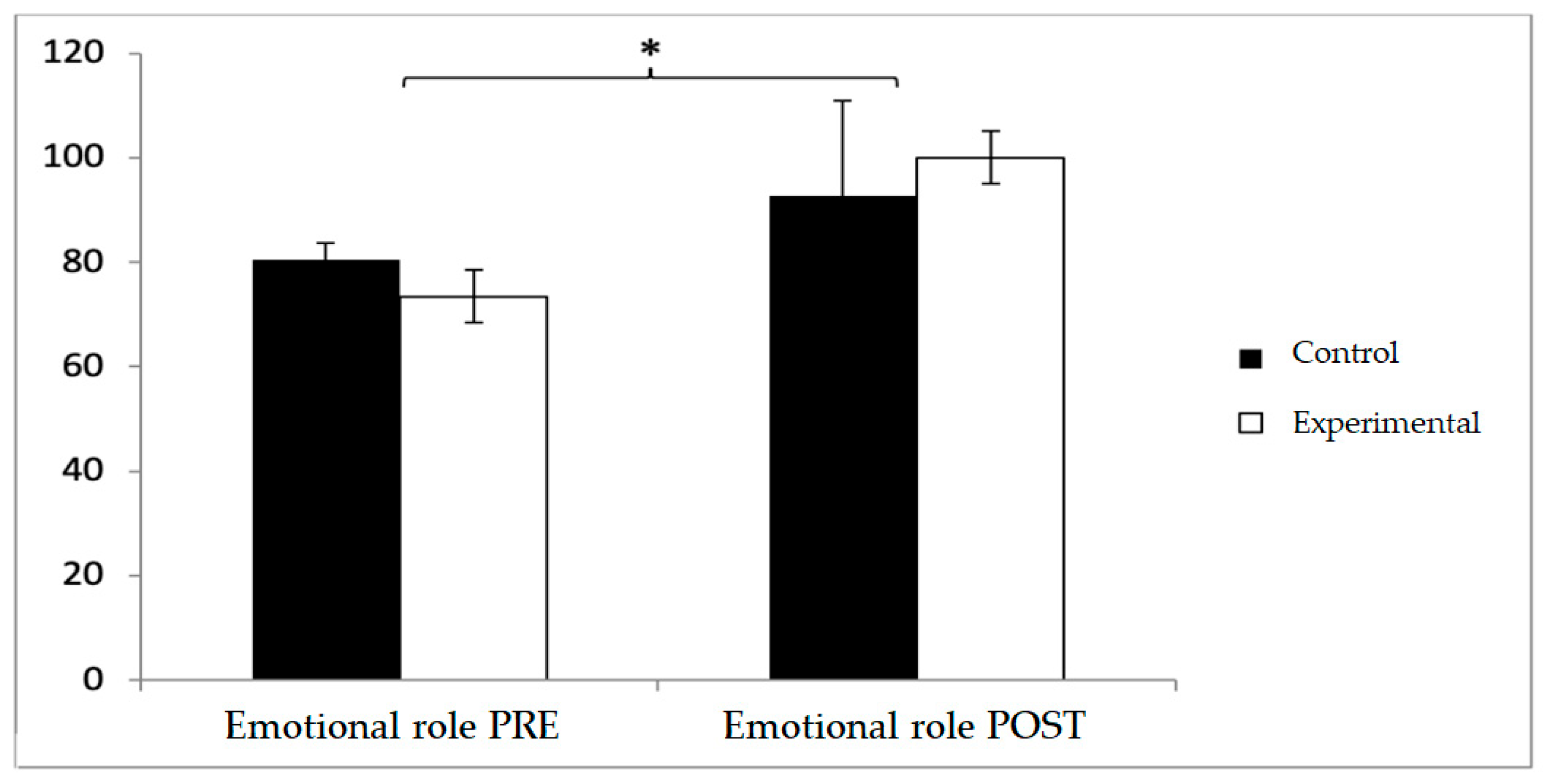 In emotional role, baseline values were higher in the control group (80.48 ± 22.47 vs. 73.46 ± 28.44), but post-intervention, the experimental group surpassed the control group (100 ± 32.21 vs. 92.67 ± 30.99). No significant effects were found for Group × Time or Group, although a significant effect was observed for Time (F(1,102) = 4.280,