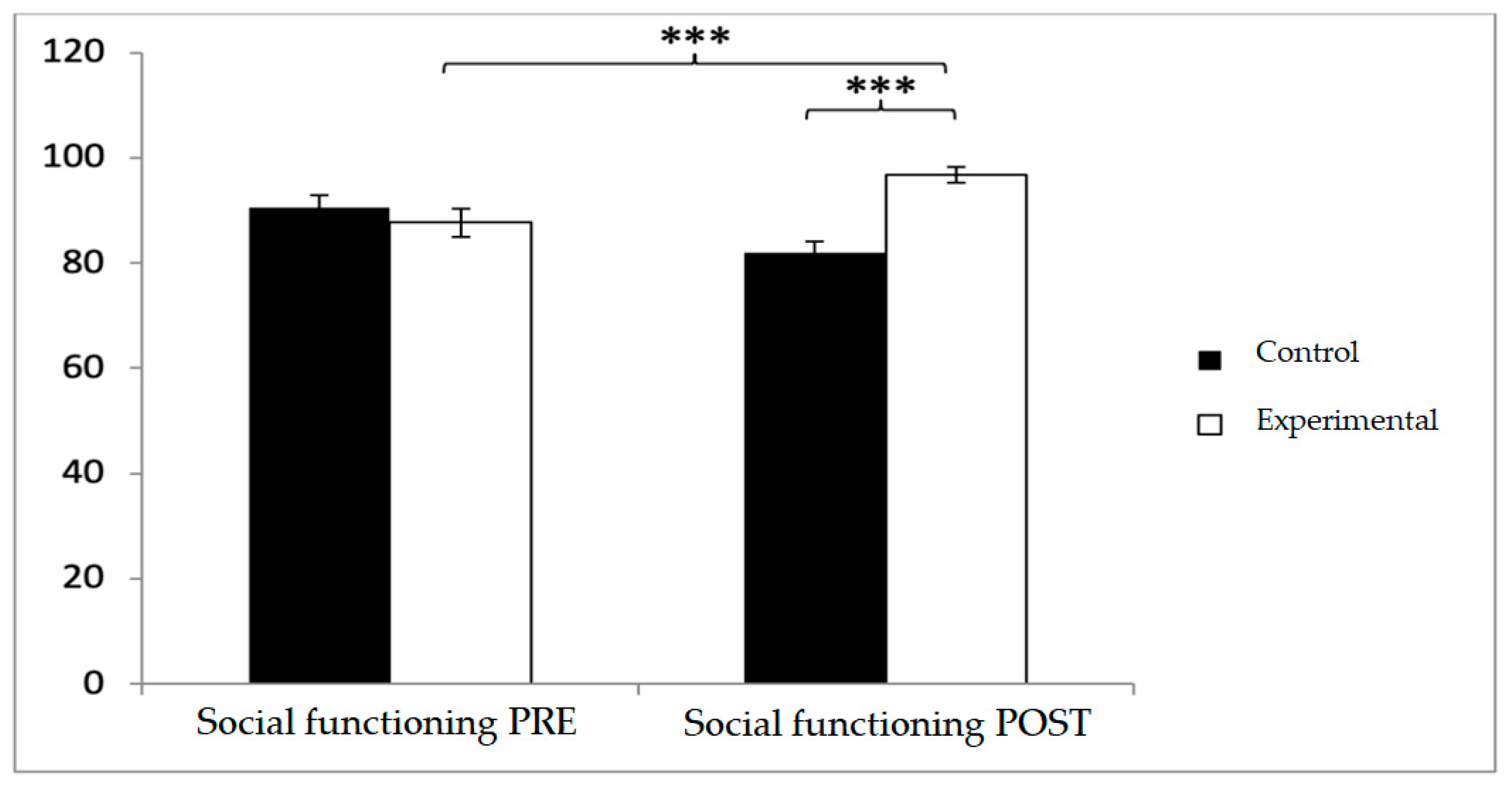 In social functioning, participants in the control group reported higher baseline scores (90.46 ± 17.19 vs. 87.65 ± 19.67), but post-intervention, the experimental group reported significantly higher values (96.69 ± 10.71 vs. 82.46 ± 14.82;