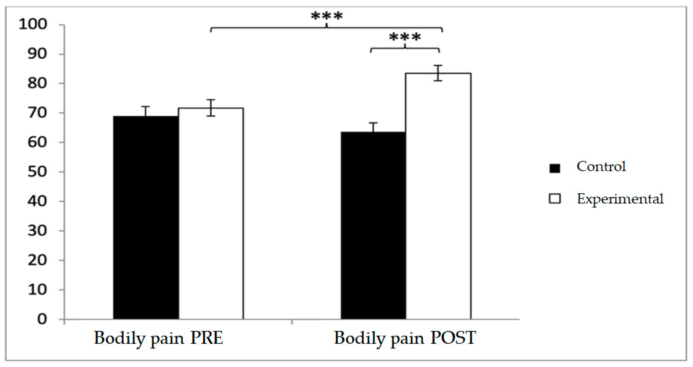 For bodily pain, the experimental group scored higher at both baseline (71.75 ± 19.93 vs. 69.25 ± 22.90) and post-intervention (83.56 ± 18.28 vs. 63.56 ± 23.07). Significant effects were observed for Group × Time (F(1,102) = 24.210,