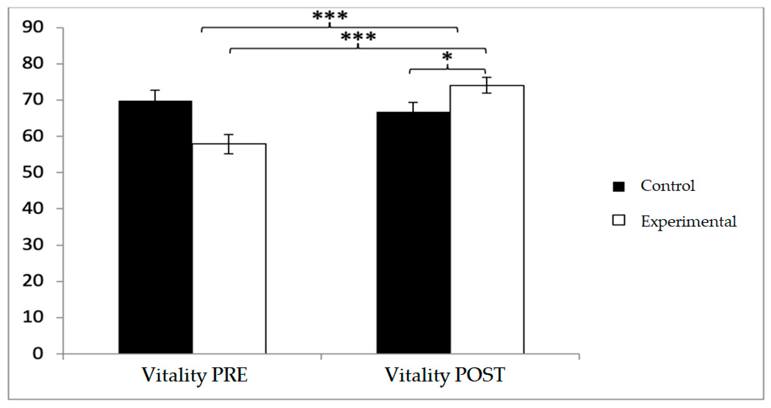 In vitality, baseline scores were higher in the control group (69.90 ± 20.54 vs. 57.88 ± 19.06), but post-intervention, the experimental group reported higher values (74.04 ± 15.78 vs. 66.73 ± 18.68). Significant effects were found for Group × Time (F(1,102) = 51.507,