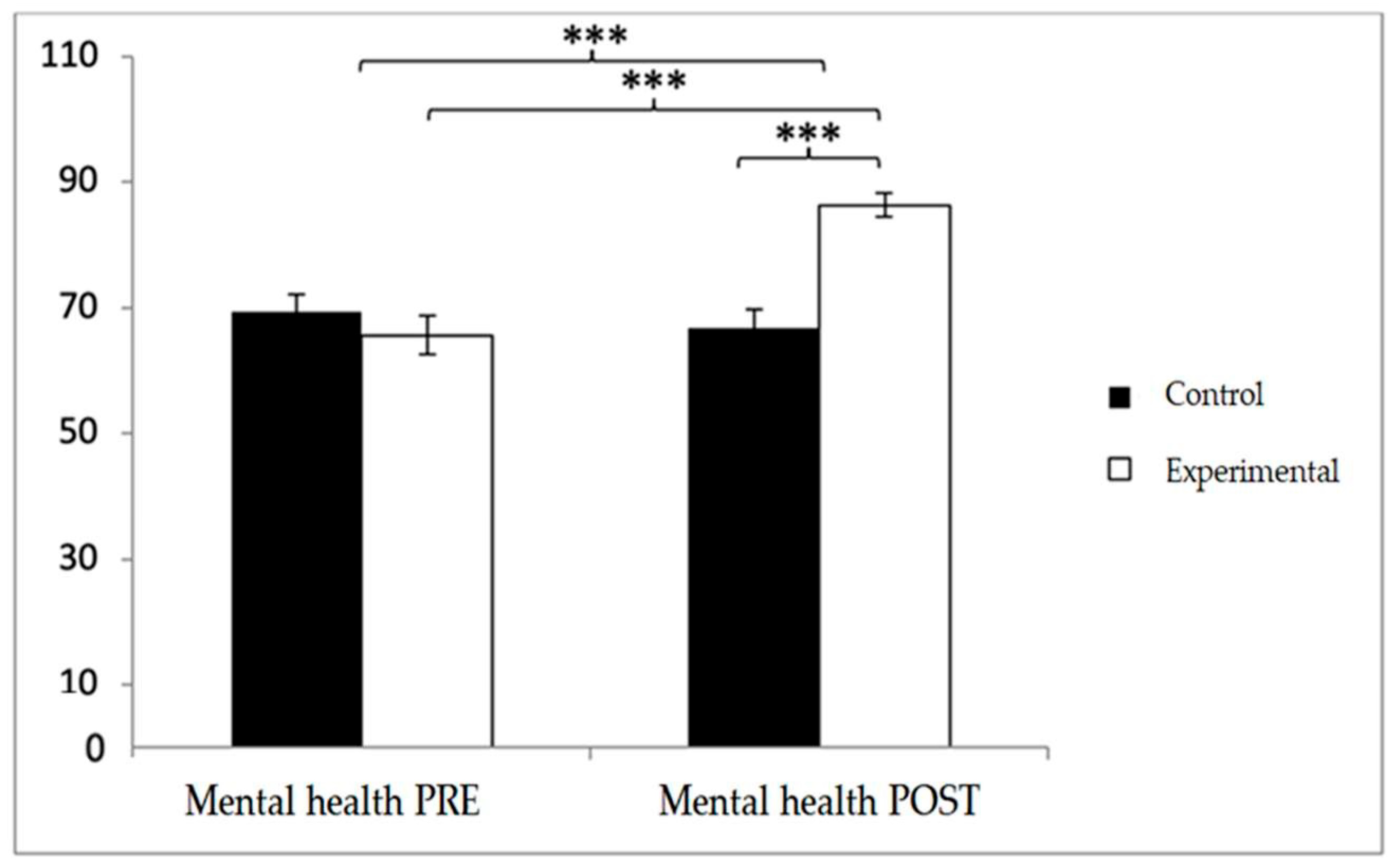 In mental health, baseline scores were higher in the control group (69.38 ± 19.51 vs. 65.62 ± 22.69), but post-intervention values were greater in the experimental group (86.31 ± 13.91 vs. 66.75 ± 20.68). Significant effects were found for Group × Time (F(1,102) = 29.060,