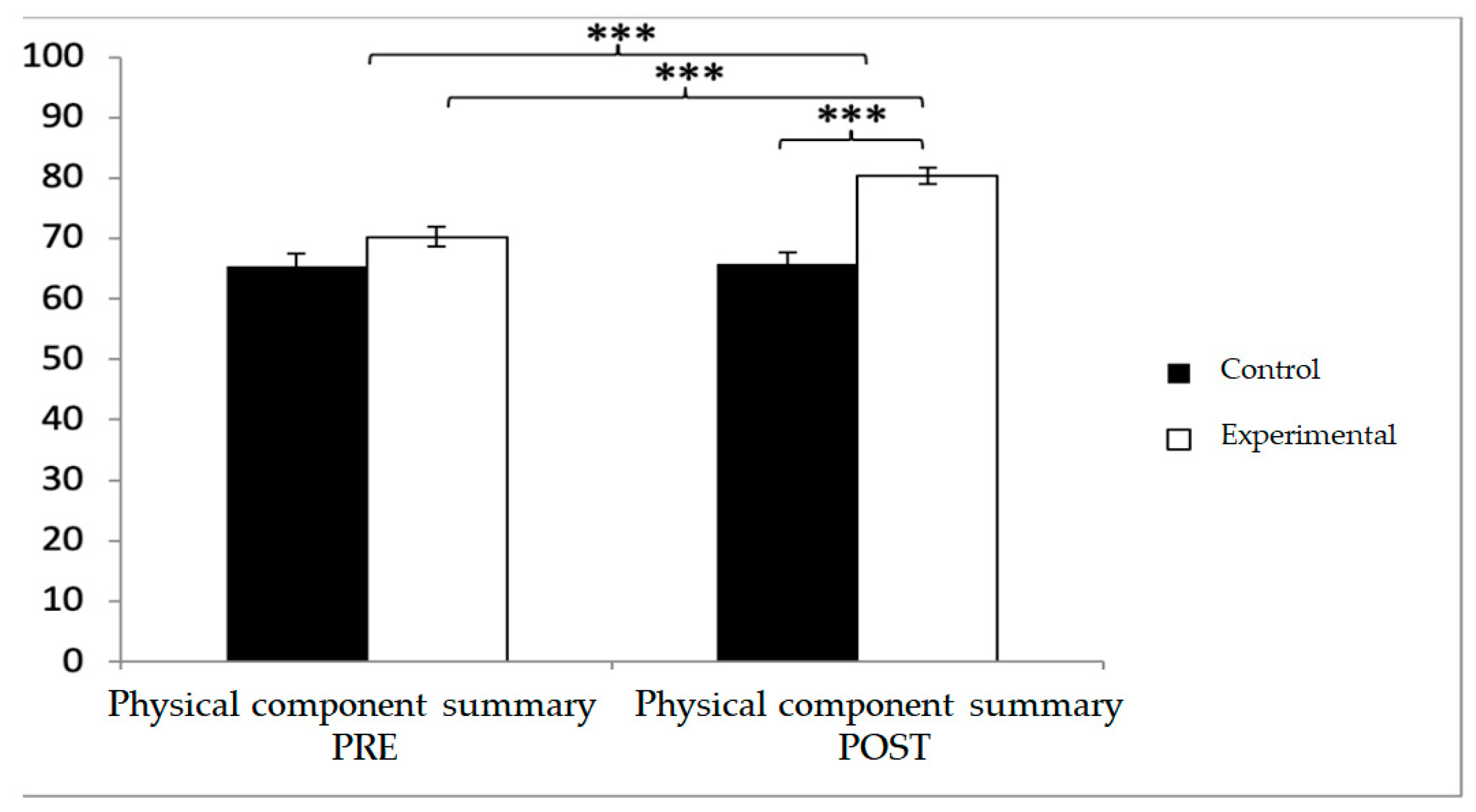 For the physical component summary, baseline values were lower in the experimental group (70.27 ± 11.56 vs. 65.46 ± 14.28), but post-intervention values were significantly higher compared with the control group (80.39 ± 9.71 vs. 65.79 ± 13.15). Significant effects were found for Group × Time (F(1,102) = 23.005,