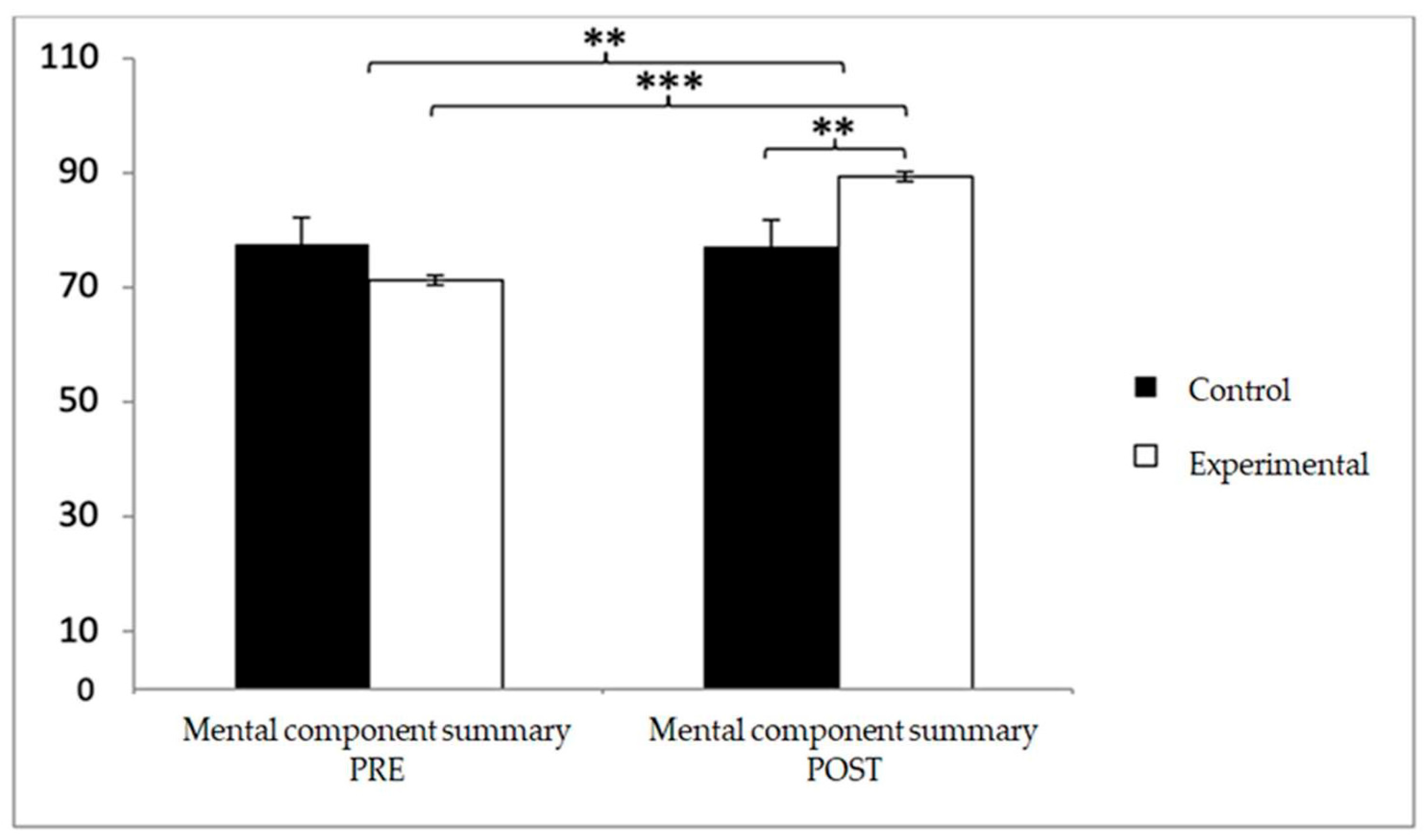 Finally, in the mental component summary, baseline scores were higher in the control group (77.56 ± 10.46 vs. 71.15 ± 11.73), but after the intervention, the experimental group reported superior outcomes (89.26 ± 6.06 vs. 77.15 ± 2.35). Significant effects were observed for Group × Time (F(1,102) = 13.938,