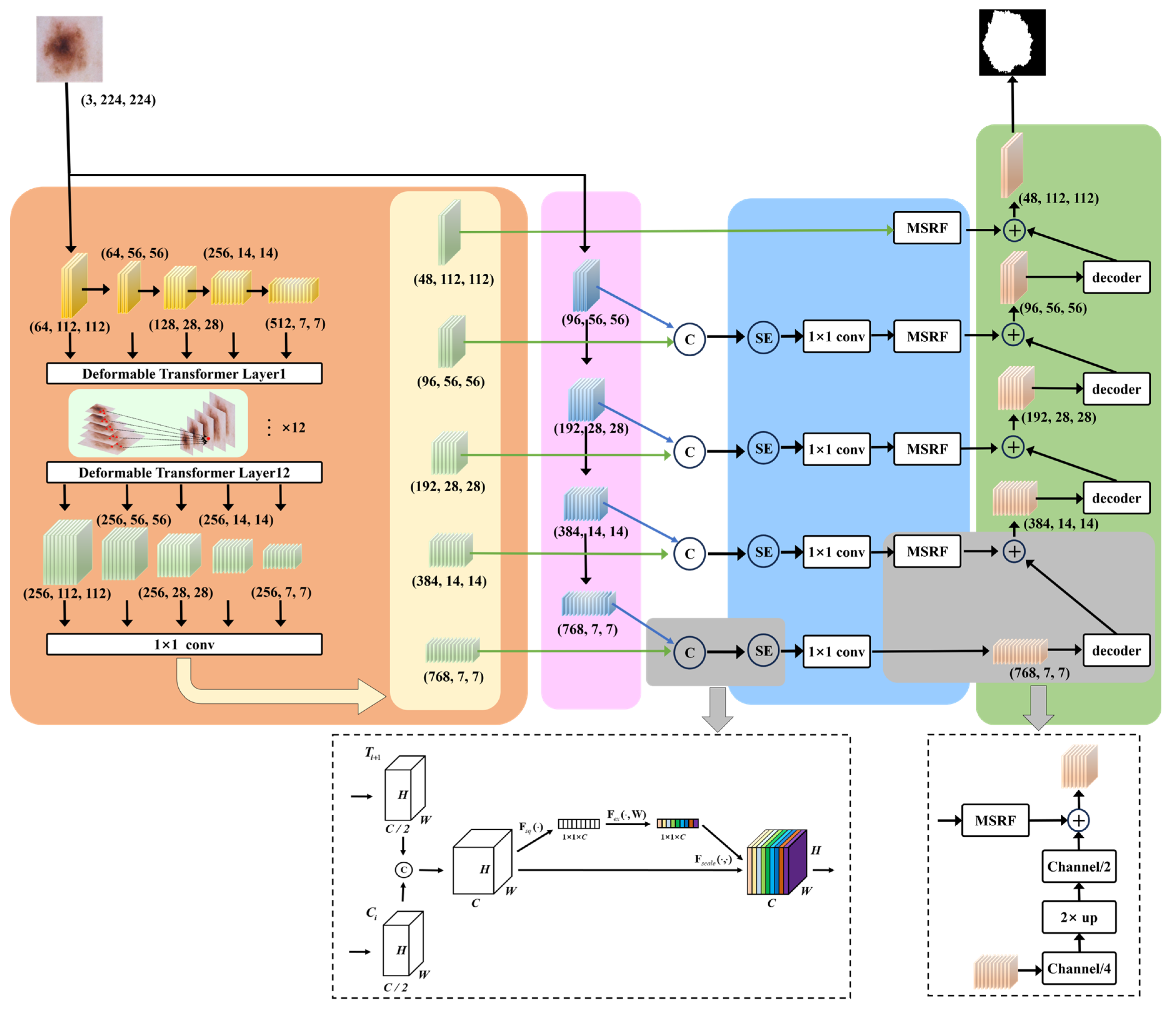 Figure 1. This chapter mainly introduces the network’s overall architecture, including data preprocessing, feature extraction, feature enhancement, decoding, and the loss function. For data preprocessing, we employ a series of morphological operations to remove hair artifacts from the images, ensuring clearer inputs for segmentation. For feature extraction, we use a dual-encoder architecture, with ConvNeXt capturing local details and Deformable Transformer modeling long-range dependencies to enhance global context. For feature enhancement, we introduce the Squeeze-and-Excitation (SE) mechanism to perform channel-wise adaptive weighting, alongside the Multi-Scale Receptive Field (MSRF) module, which captures features across multiple scales using multi-branch and dilated convolutions. For decoding, we propose the Hierarchical Feature Transfer (HFT) mechanism that effectively restores spatial details by combining high-level semantic information with low-level features, improving segmentation accuracy. For the loss function, we adopt a hybrid loss function to improve the overall segmentation accuracy of the model, enhancing its performance in detecting lesion areas.