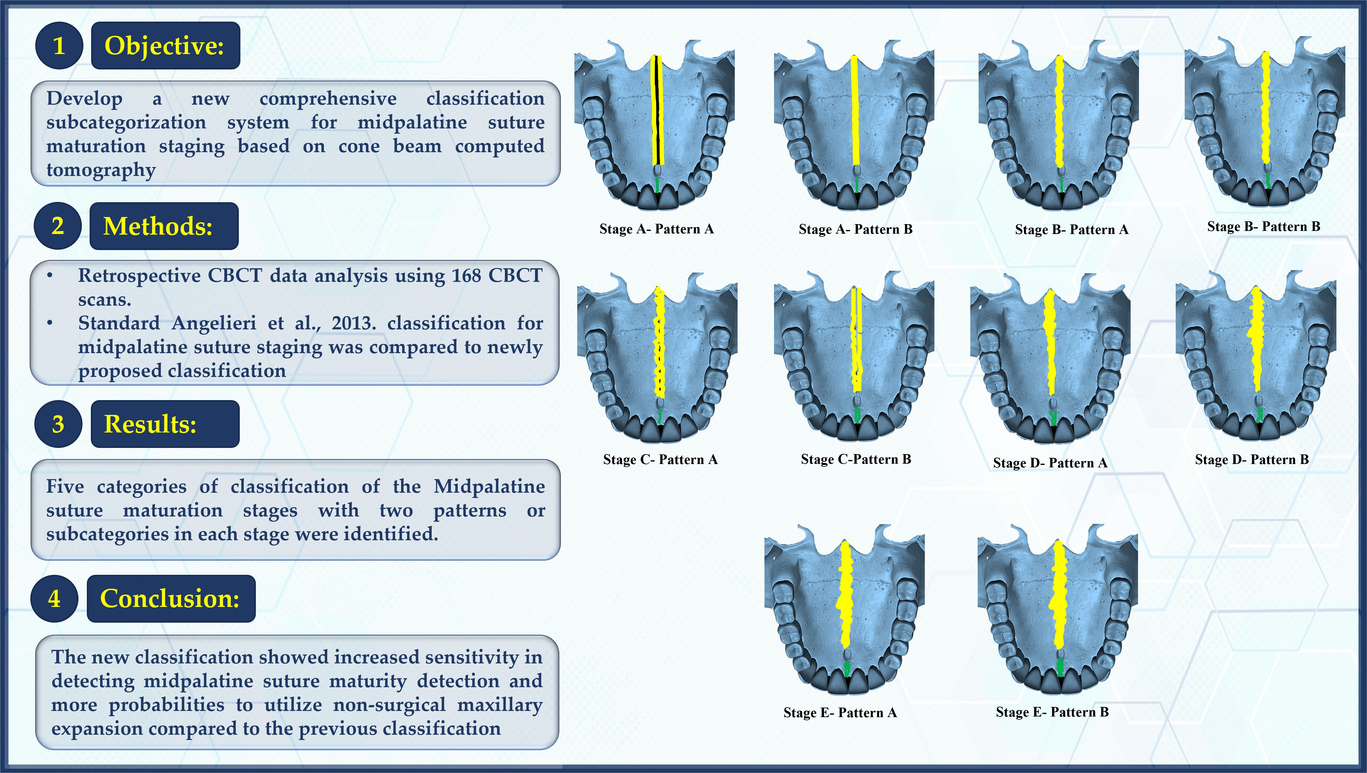 Thus, in stages and patterns of MPS maturation according to the new classification, where the MPS is open or partially ossified from Stage A to Stage D, Pattern A, non-surgical maxillary expansion techniques can be considered including RME, SME, and MARPE [