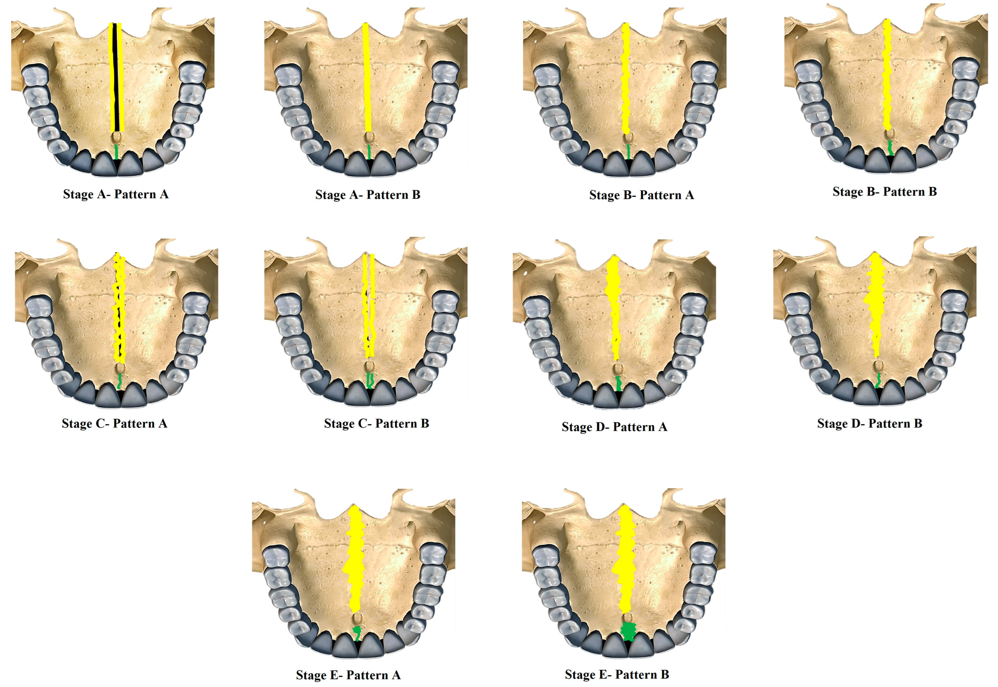 Stage B—Pattern A—Single straight high-density sutural line in the maxillary region, comparable to Stage A. The suture is single scalloped toward the palatal bone region.