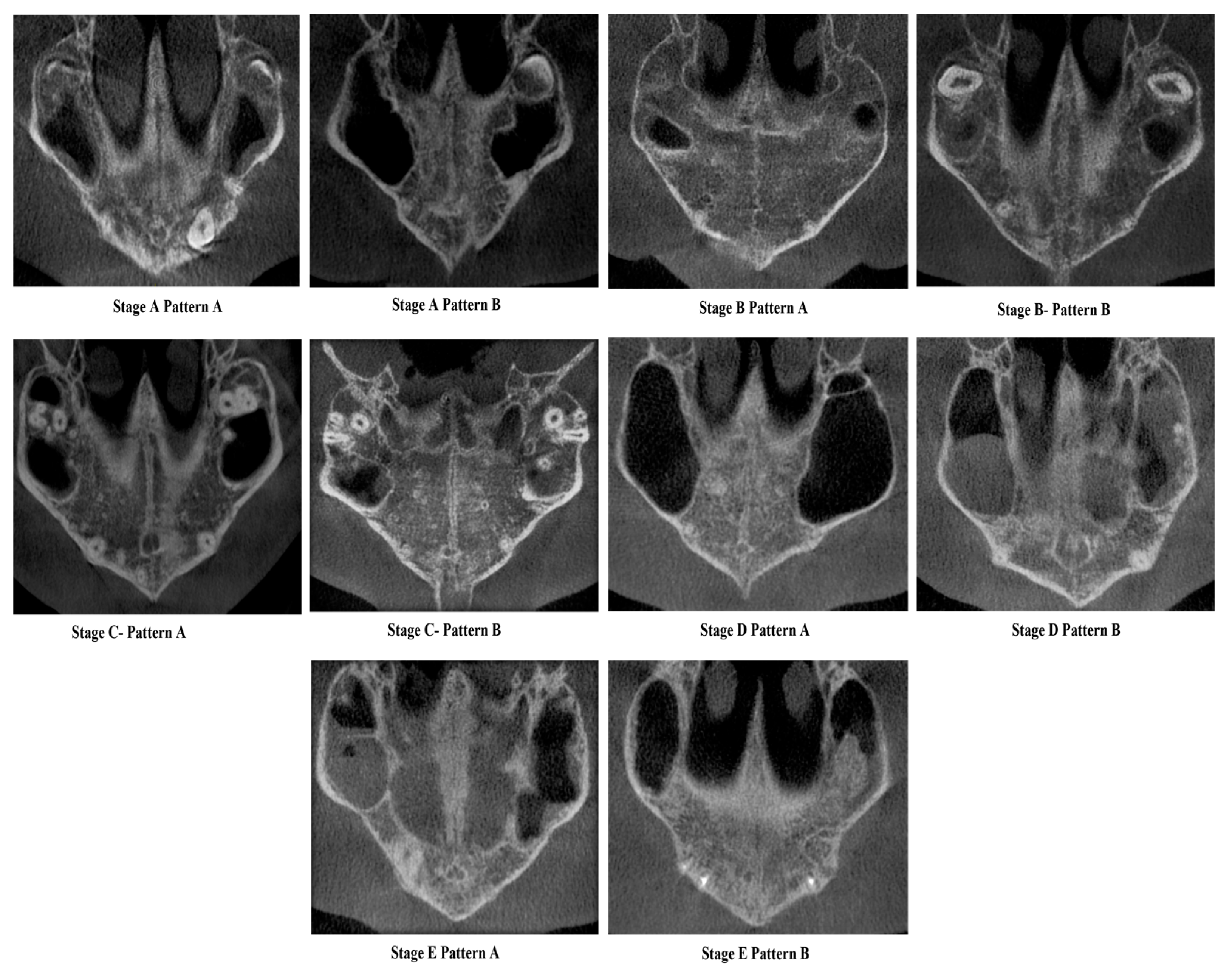 Stage C—Pattern B—Similar to the previous standard classification Stage C—Continuous or irregular-2 RO, non-scalloped or scalloped, parallel lines separated by low-density (RL) areas in the palatal and premaxillary region.