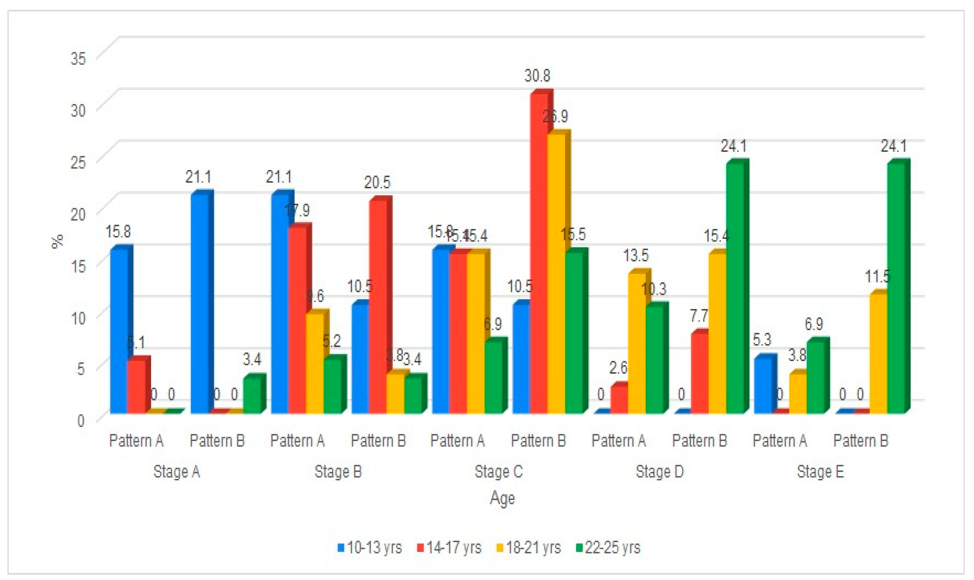 The classification across five developmental stages (Stage A to Stage E) is further divided into two patterns (Pattern A and Pattern B), as proposed. The data was organized by age group (10–13, 14–17, 18–21, 22–25 years) and gender (male, female). In younger age groups (10–13, 14–17), more subjects are found in the earlier stages (A, B, C), with a larger spread across both patterns. As age increases (18–21, 22–25), a noticeable shift occurs, with more individuals progressing to later stages (D, E), particularly in Pattern B. The distribution between Pattern A and Pattern B within each stage shows some gender and age-related variation.