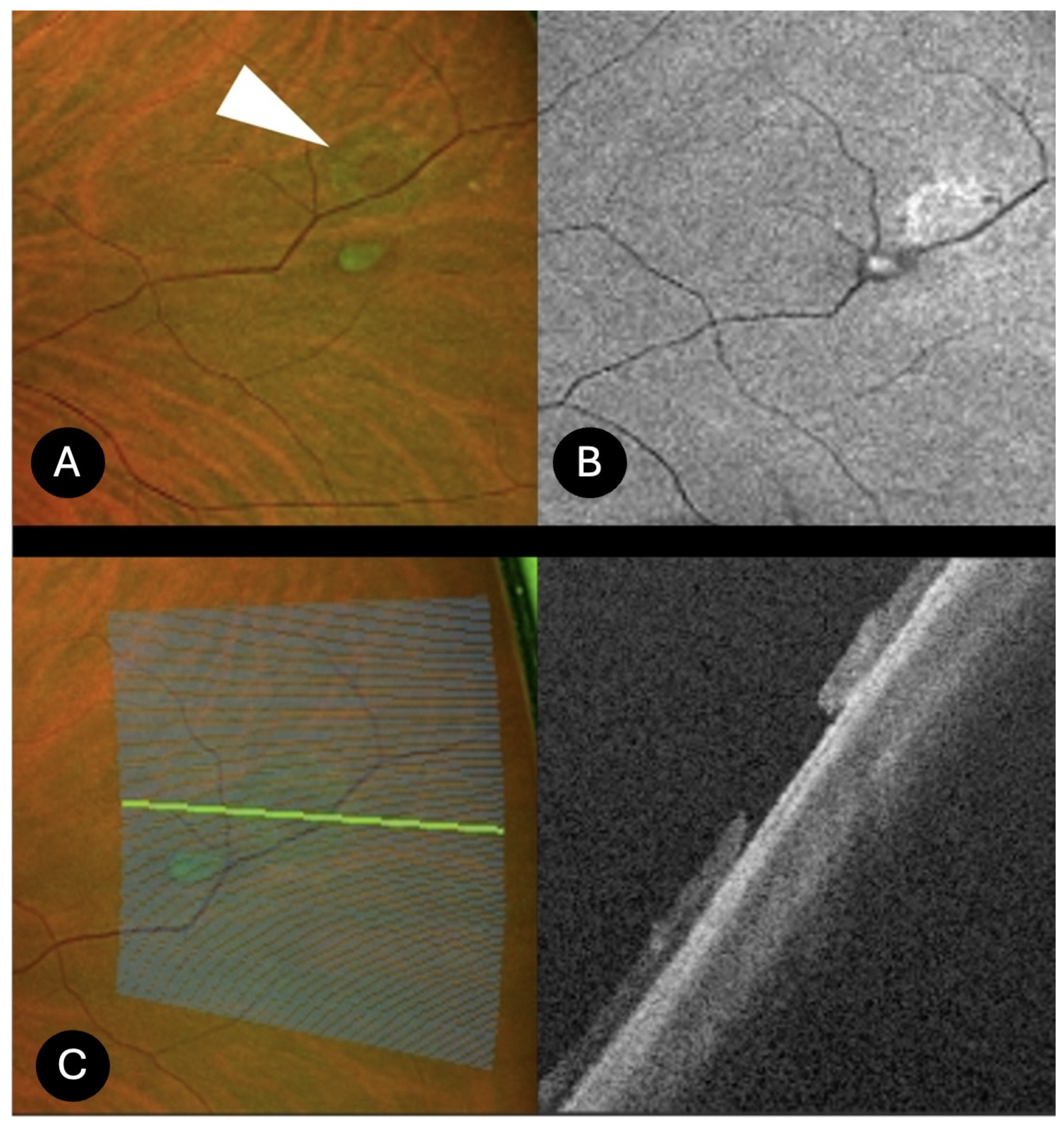 - Diaz, R.I.; Sigler, E.J.; Randolph, J.C.; Rafieetary, M.R.; Calzada, J.I. Spectral Domain Optical Coherence Tomography Characteristics of White-Without-Pressure. Retina 2014, 34, 1020–1021. [Google Scholar] [CrossRef]