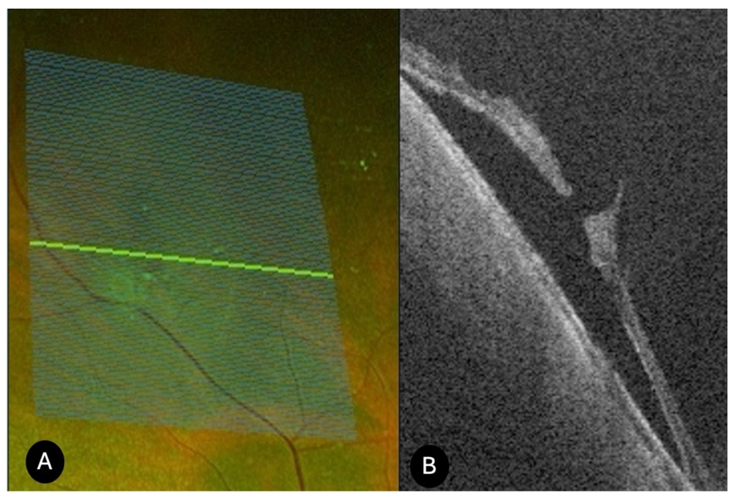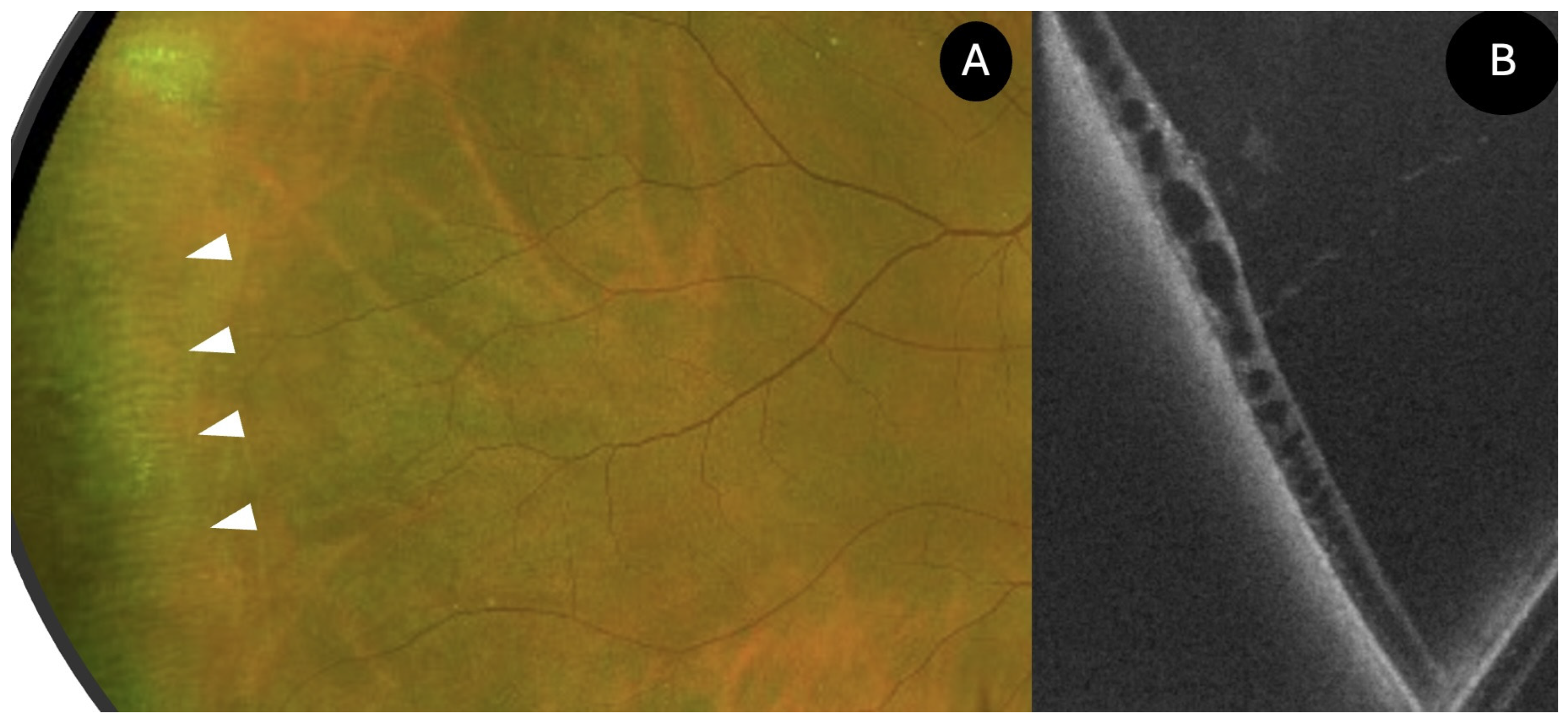 - Govetto, A.; Sebag, J.; Lucchini, S.; Ballabio, C.; Matteucci, M.; Ranno, S.; Carini, E.; Virgili, G.; Bacherini, D.; Radice, P. Imaging Rhegmatogenous Retinal Lesions and Peripheral Vitreoretinal Interface with Widefield Optical Coherence Tomography. Retina 2024, 44, 269–279. [Google Scholar] [CrossRef]