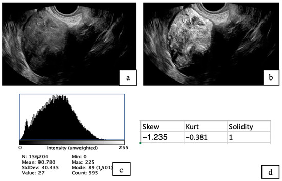 Figure 1. TVS images of uterine fibroids before (a) and after analysis using Fiji software (b). The post-analysis image highlights the presence of tiny cystic areas within the fibroid. A histogram (c) was generated to evaluate pixel intensity distribution, and additional quantitative analysis (d) was conducted to assess tissue characteristics, including skewness, solidity, and kurtosis. - In ImageJ, intensity refers to the brightness level of each pixel in a grayscale image, typically measured on a scale from 0 (black) to 255 (white) in 8-bit images.