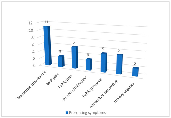 A total of 41 patients were included in the study. The age range of participants was 31 to 56 years, with a mean age of 44.27 ± 6.66 years. The most common chief complaints were menstrual disturbance (26.8%), pelvic pain (14.6%), pelvic pressure (12.2%), abdominal discomfort (12.2%), and back pain (7.3%), among others (Figure 2).