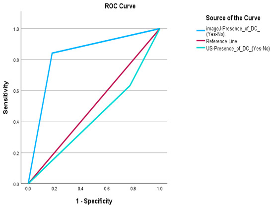 Receiver Operating Characteristic (ROC) Curve for Ultrasound and Postprocessed Ultrasound Using ImageJ Compared to MRI.