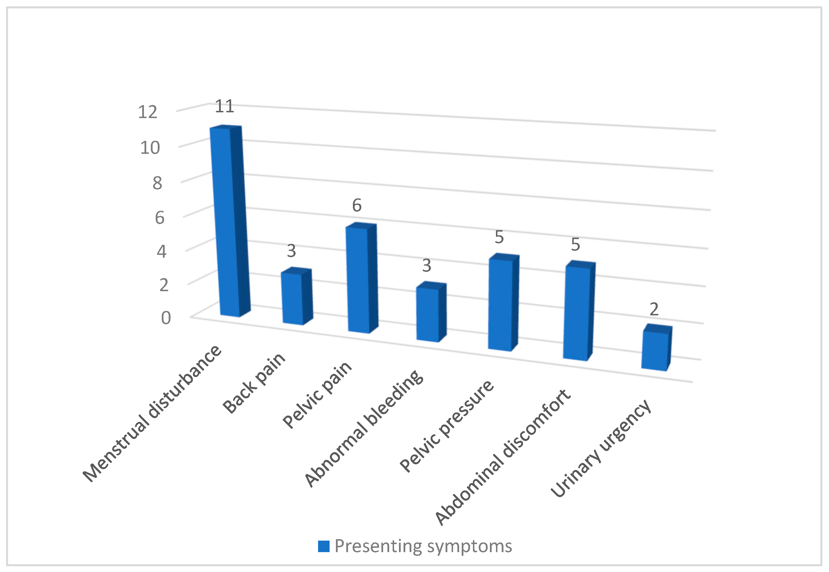 29] (Ali et al., 2023). The most commonly reported symptom was menstrual disturbances (26.8%), followed by pelvic pain (14.6%), consistent with previously published reports linking fibroid-related symptom burden to size and degeneration type [