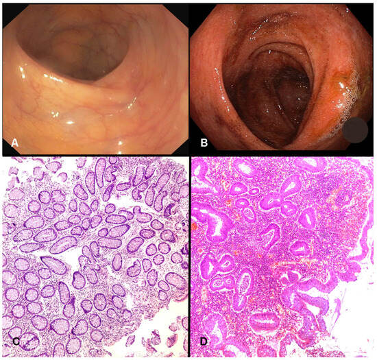 Endoscopic and histologic assessment of disease activity. (A) Endoscopic view consistent with Mayo 0, showing normal colonic mucosa without signs of inflammation. (B) Endoscopic appearance corresponding to Mayo 2, characterized by marked erythema, loss of vascular pattern, and friability. (C) Histologic section compatible with Geboes 0.2, demonstrating low architectural distortion with chronic inflammatory infiltrate but without intraepithelial neutrophils (×10 magnification). (D) Histologic section consistent with Geboes 3.2, showing active inflammation with marked presence of neutrophils in colonic epithelium and crypt abscesses (×10 magnification).
