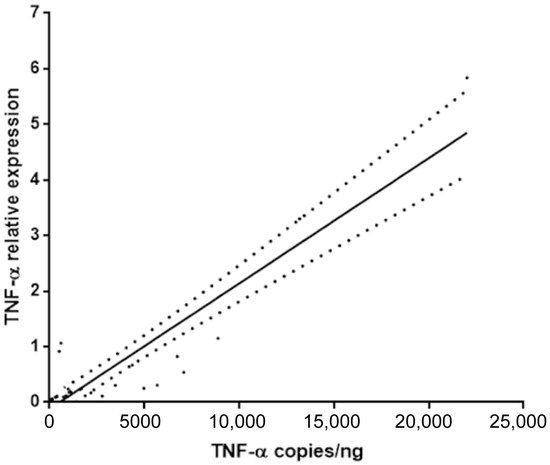 The primary objective of this study was to determine if TNF-α mRNA quantification from routine FFPE tissues could serve as a reliable surrogate for the more complex analysis of fresh-frozen tissue. A linear regression analysis was performed comparing the TNF-α levels measured in fresh tissue (expressed as copies/ng) and the relative TNF-α expression quantified by RT-qPCR in matched FFPE samples (expressed as 2−ΔΔCt).