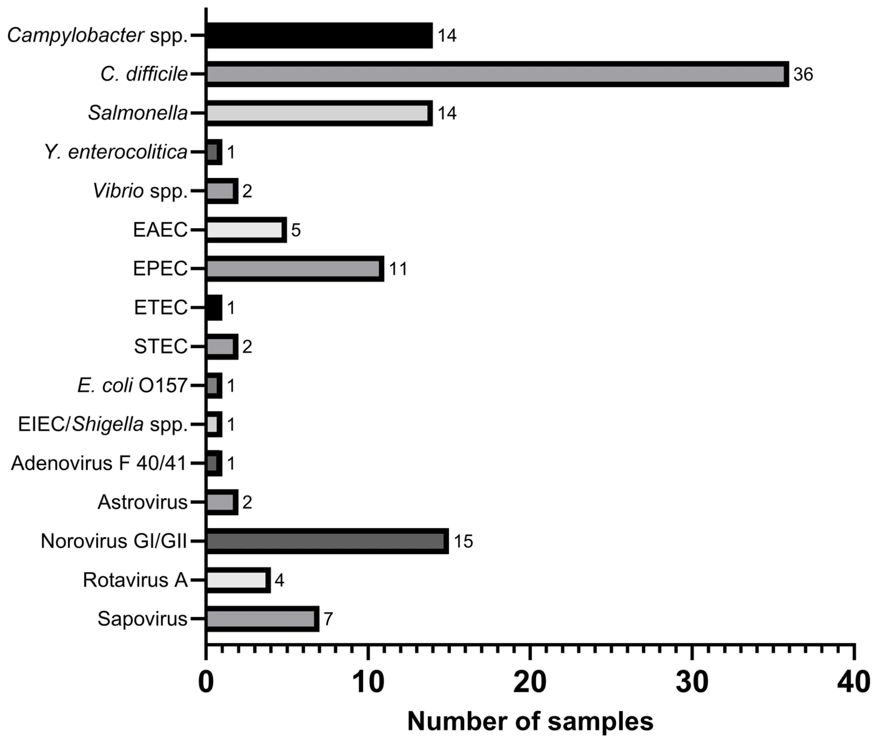 In this study, FA-GIP detected bacterial pathogens in 75.2% of the IGE samples, with C. difficile as the most frequently identified pathogen (40.9%), followed by Campylobacter spp. and Salmonella spp. (both 15.9%). Similarly, a study conducted by Torres-Miranda et al. in Washington, DC, USA, reported C. difficile as the most common pathogen (71/129, 55.0%), followed by Campylobacter spp. (27/129, 20.9%), and Salmonella spp. (16/129, 12.4%) [14].