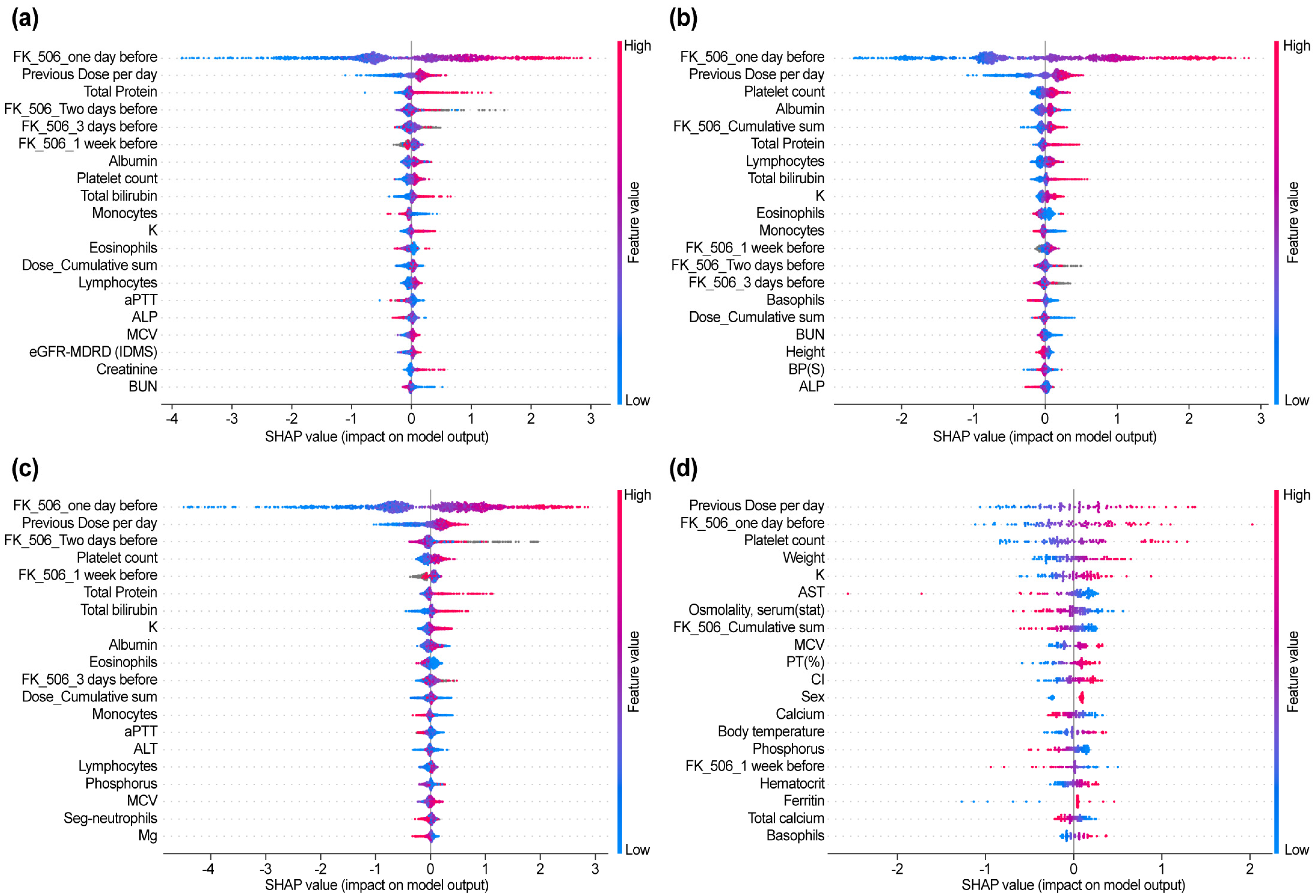 SHAP analysis facilitates an understanding of the contribution of features to the four ML models. The results of this analysis highlight the importance of recent tacrolimus dose, cumulative clinical observations, and patient-specific biochemical and physiological characteristics. By integrating the aforementioned variables, the models have the potential to improve personalized dosing strategies.
