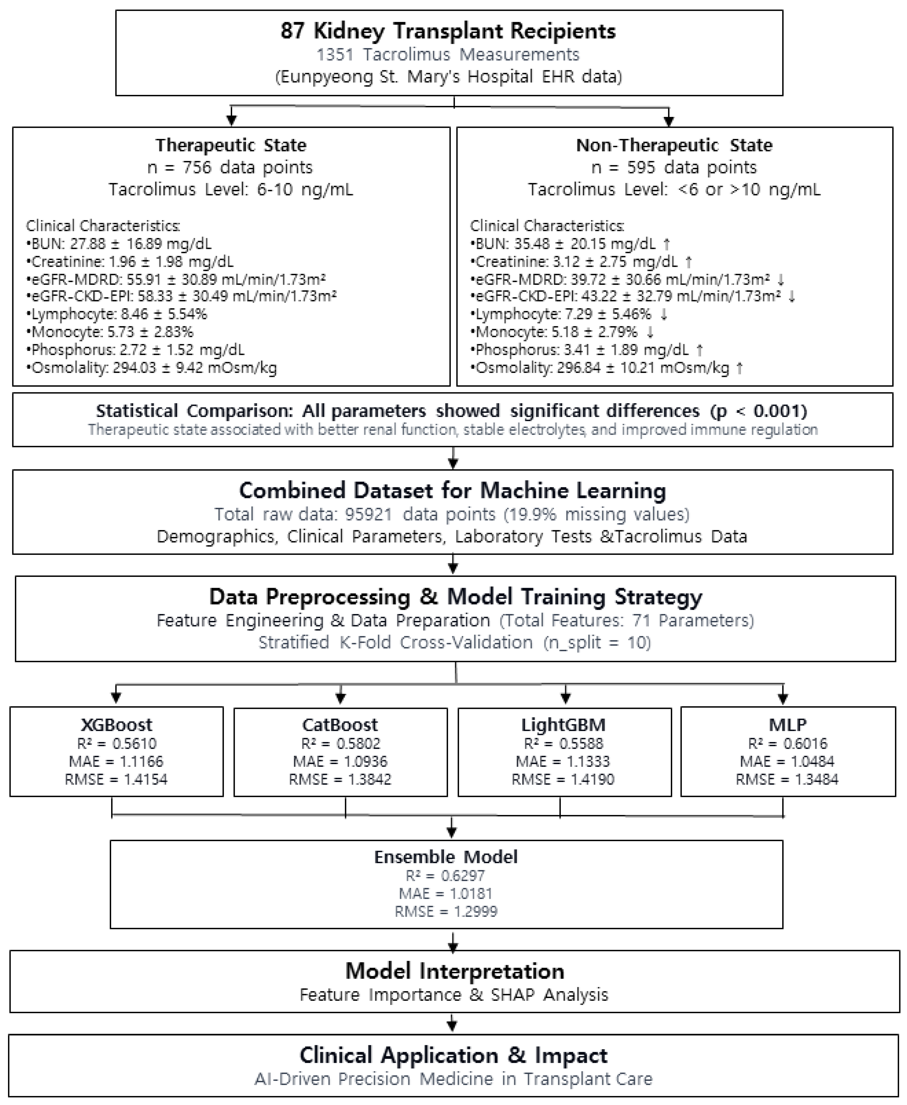 The initial tacrolimus dose was determined empirically based on the patient’s age, gender, height, and weight. Conversely, dose adjustments were based on the daily monitoring of renal function and tacrolimus concentration through serum creatinine levels. In this study, four ML and deep learning models were used to predict the tacrolimus concentration of the next day using 79 parameters representing the aforementioned factors. These models included three regression models—eXtreme Gradient Boosting (XGBoost), Categorical Boosting (CatBoost), and Light Gradient Boosting Machine (LGBM)—and a deep learning multilayer perceptron (MLP) model. The tacrolimus drug concentration lag variable and cumulative dose indicator were integrated using the feature extraction technique to improve the temporal data representation. The continuous variables were standardized to ensure a consistent scale across features. The stratified K-fold method was used to train the model, with n_split = 10; thus, all the data were used for training using the out-of-fold (OOF) method by dividing the training and validation data at a 9:1 ratio and training for 10 splits. Stratified k-fold cross-validation was used to optimize the model hyperparameters and maximize the prediction performance.