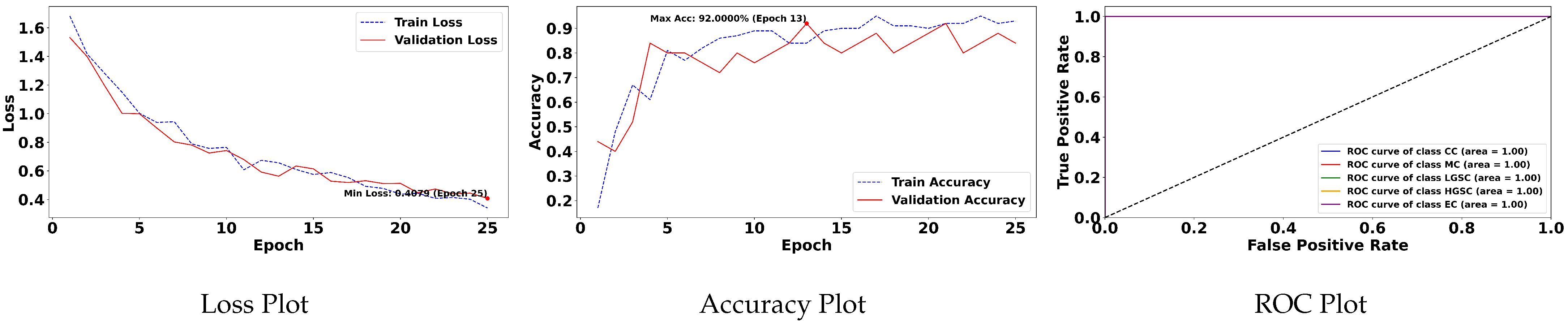 Figure 5 depicts the loss, accuracy, and roc curve trend over the epochs for the best-case scenario of