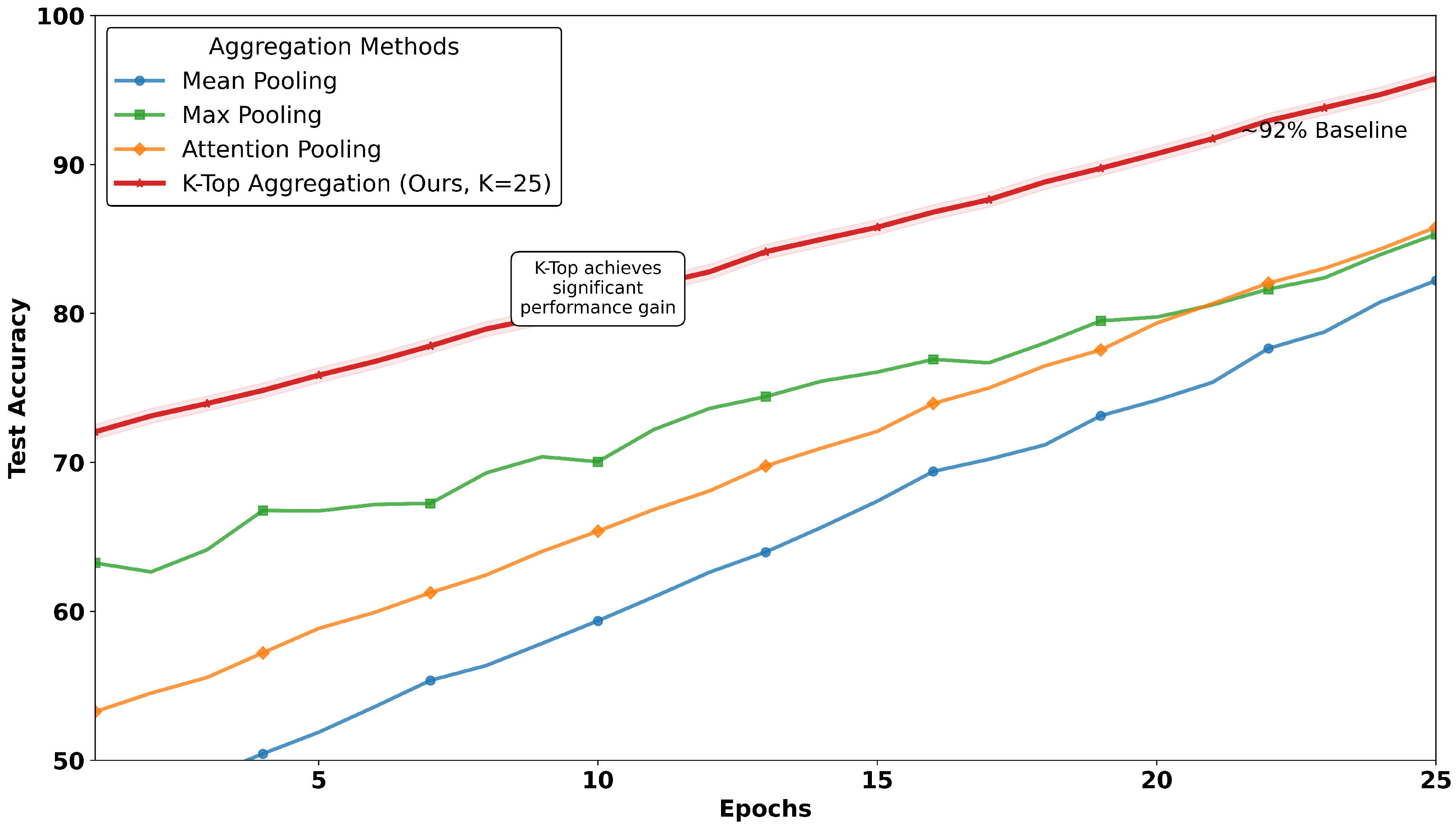K-TOP achieves a consistent and significant performance advantage, while baseline methods remain below 95%, where mean pooling methods reach 81% and max pooling touches 84%. In contrast to mean and max pooling, the attention-based MIL aggregator method reaches 86%. This trend highlights the robustness of the proposed work with