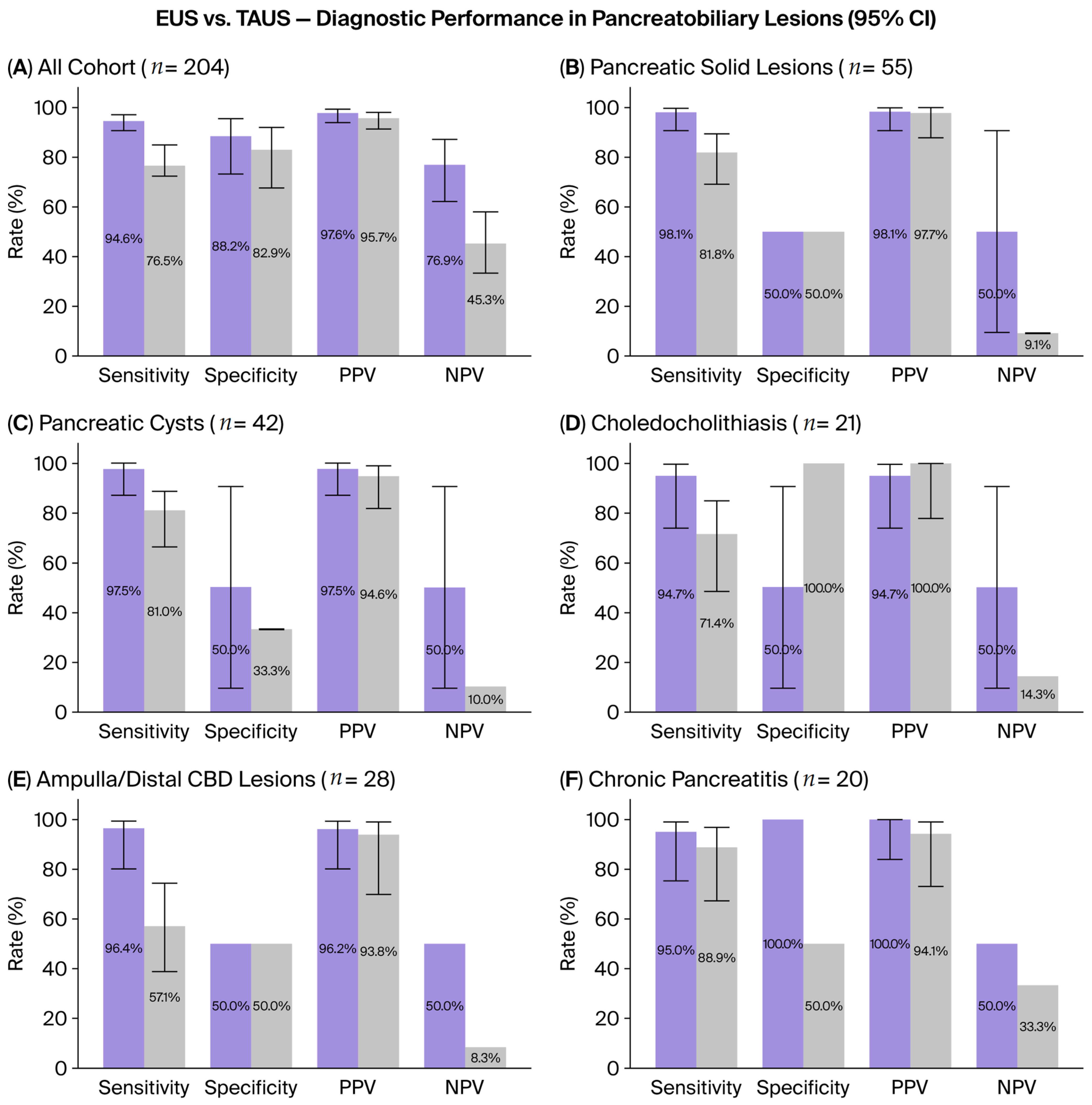 3.3. Comparison of TAUS and EUS in Subgroups of Pancreatobiliary Lesions