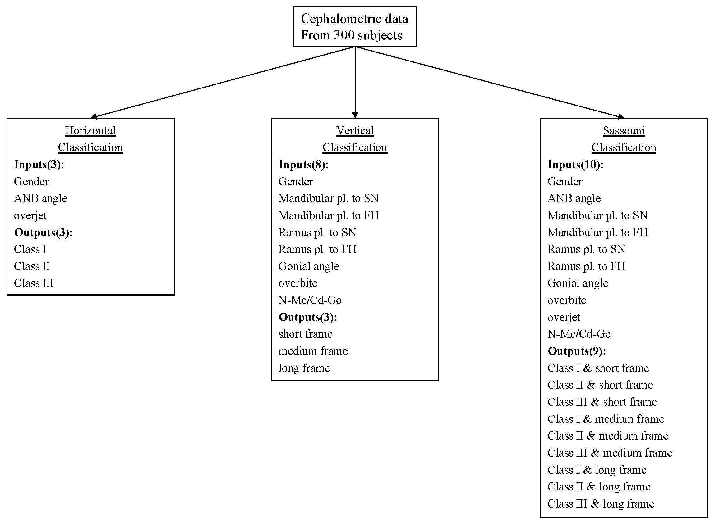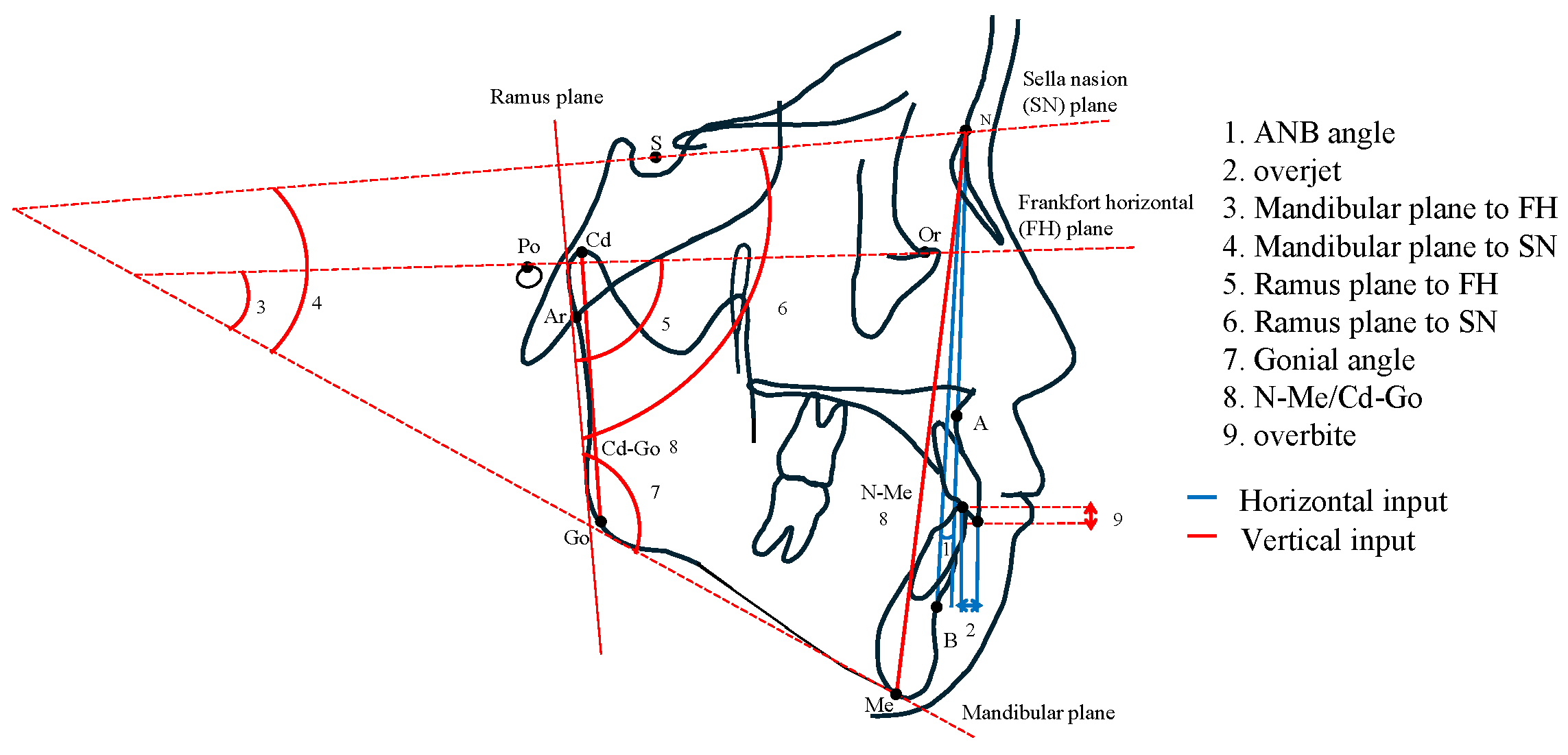 - Ueda, A.; Tussie, C.; Kim, S.; Kuwajima, Y.; Matsumoto, S.; Kim, G.; Satoh, K.; Nagai, S. Classification of maxillofacial morphology by artificial intelligence using cephalometric analysis measurements. Diagnostics 2023, 13, 2134. [Google Scholar] [CrossRef]