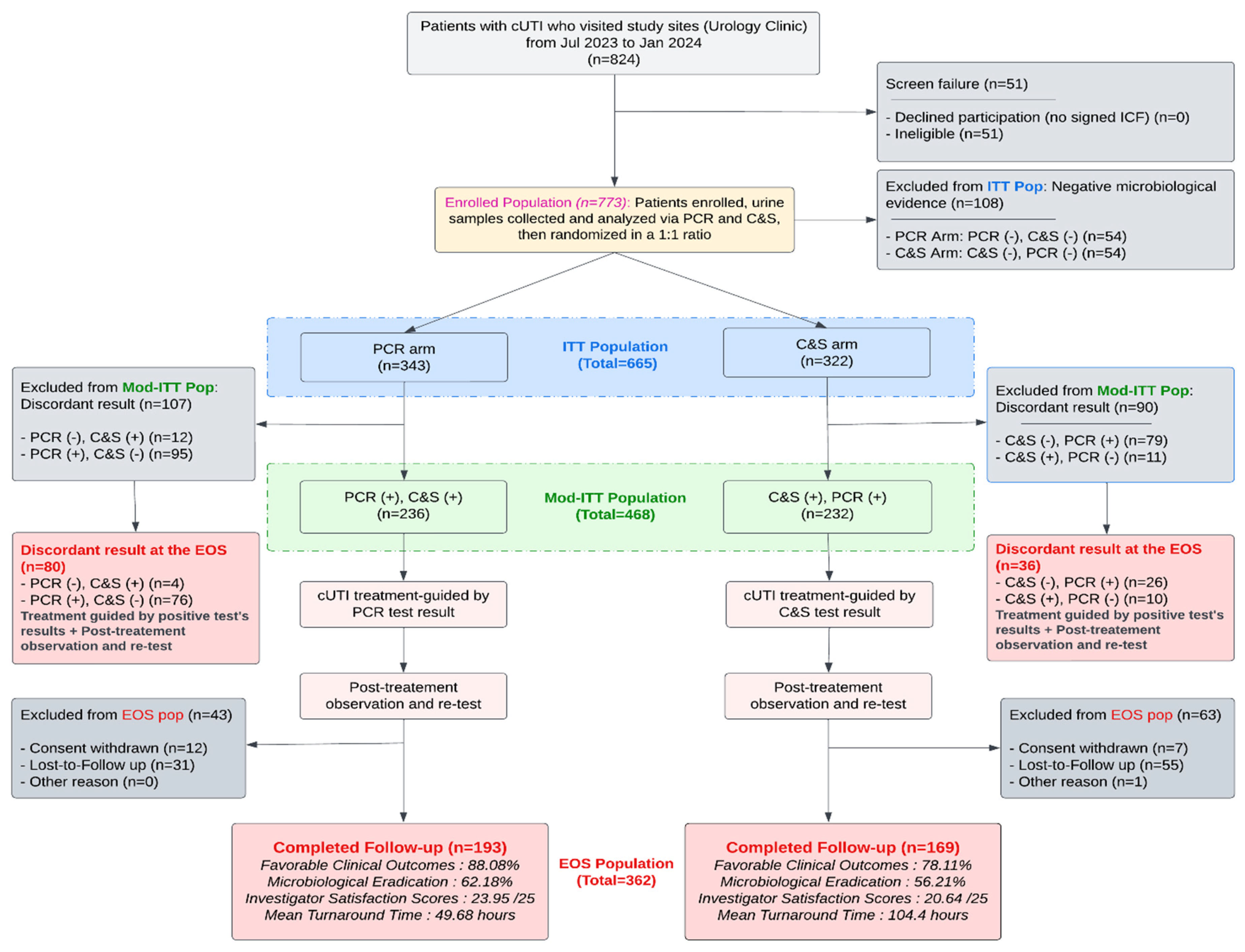 NCT06996301 was a multicenter, randomized, parallel, investigator-blinded clinical trial conducted at six geographically distinct clinical sites (physician office laboratories, “POLs”) to evaluate the clinical utility of a multiplex PCR panel vs. conventional quantitative urine culture and susceptibility testing (C&S) for the management of complicated urinary tract infections (cUTI) in adults. The trial design and primary results have been published previously [