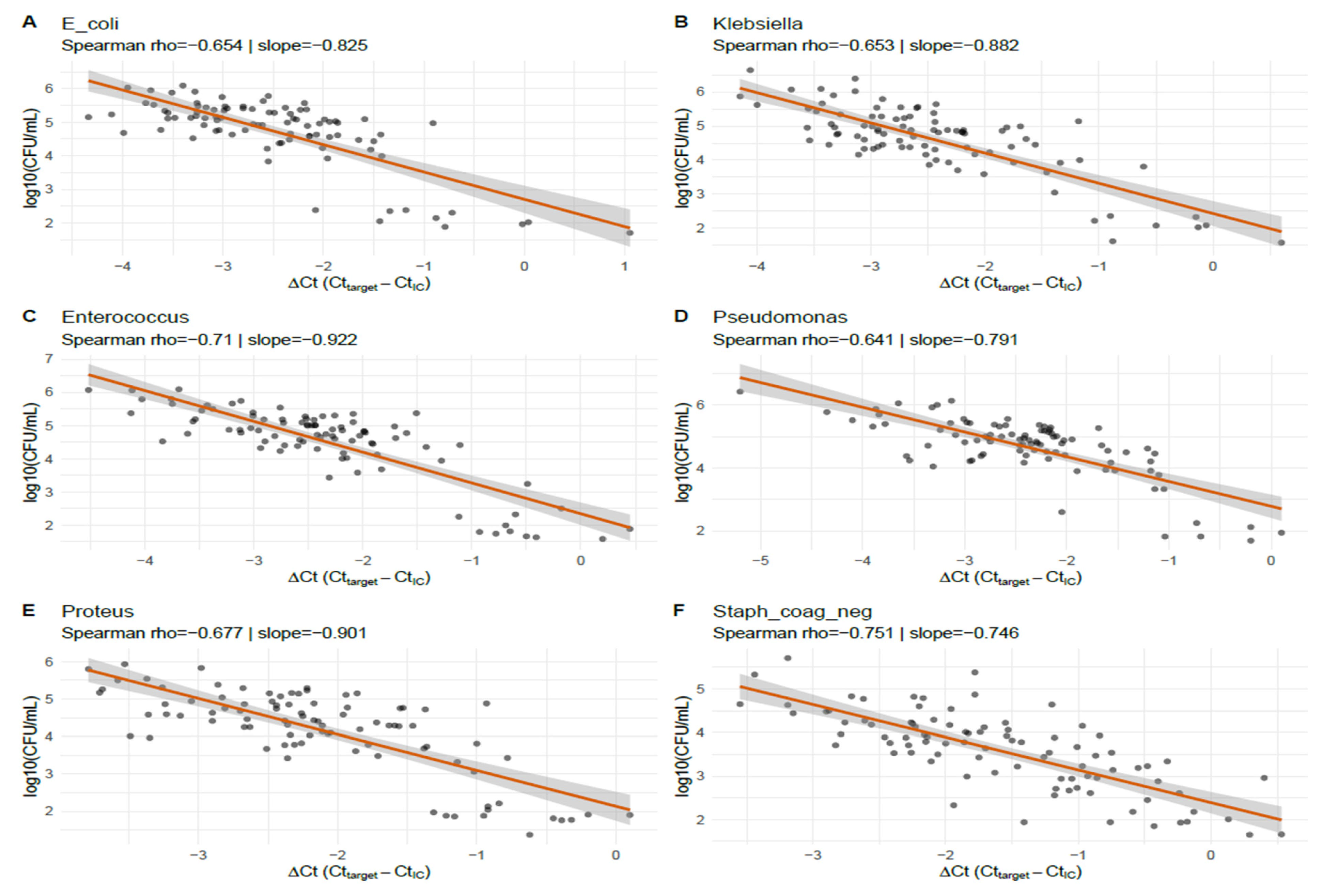 In summary, the Ct from the DOC Lab UTM 2.0 multiplex PCR panel provides a reproducible semi-quantitative signal that correlates strongly with the culture-measured bacterial burden across multiple uropathogens in the NCT06996301 dataset. A similar observation was made by Upadhyay et al. [