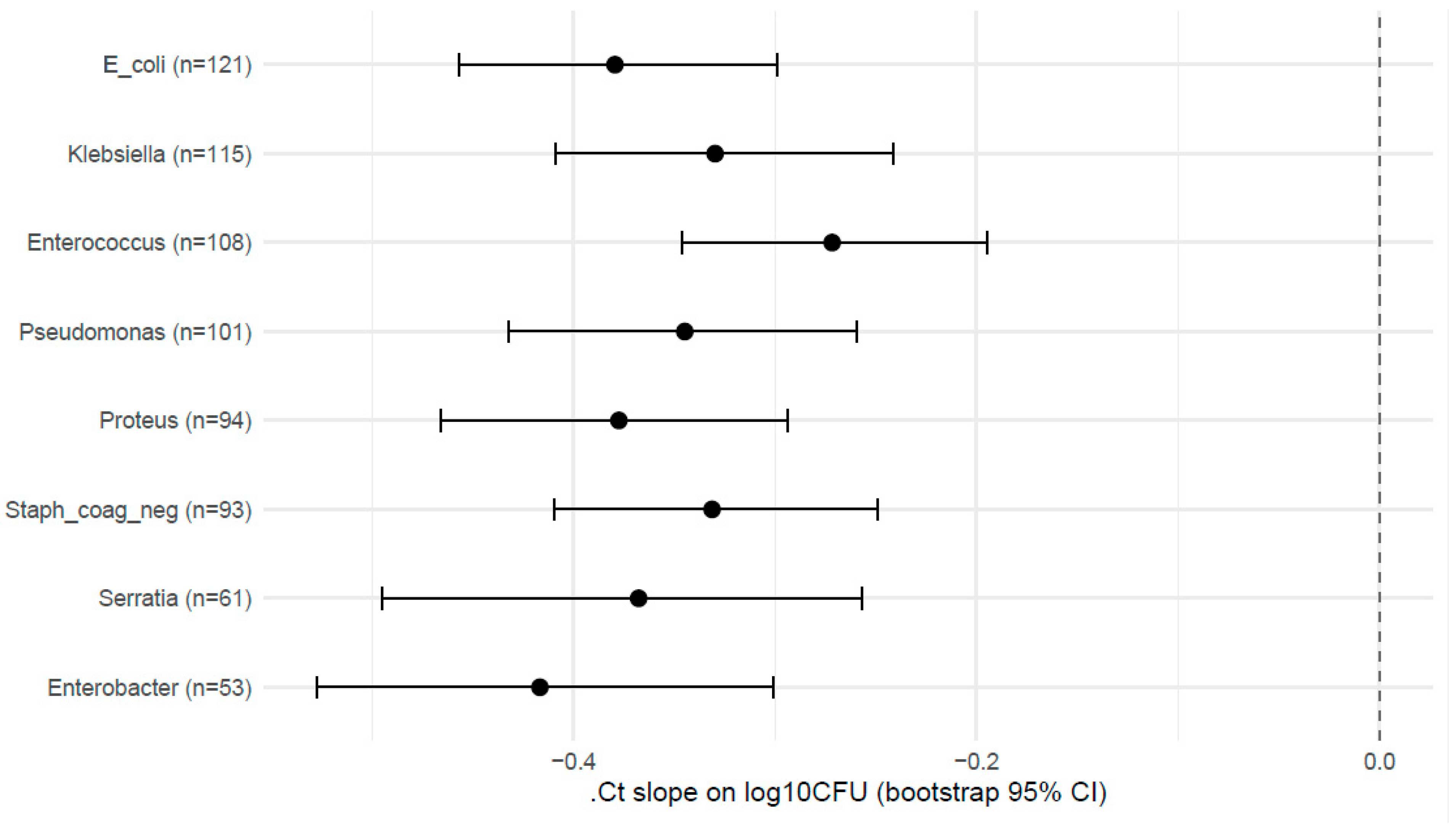 To assess the robustness of the primary Ct→CFU findings, a pre-specified sensitivity analysis was performed, including eight species with at least 50 matched PCR–culture pairs (E. coli, Klebsiella spp., Enterococcus spp., Pseudomonas spp., Proteus spp., coagulase-negative Staphylococcus, Serratia spp., and Enterobacter spp.). The lower inclusion threshold (n ≥ 50) allowed for the evaluation of additional clinically relevant species while maintaining adequate power for model stability.