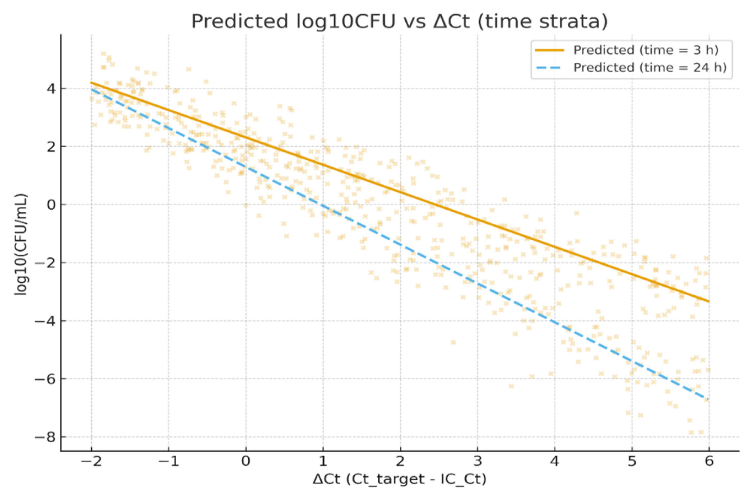 In addition, the pooled multilevel model incorporated interaction terms (ΔCt × collection_method and ΔCt × time_to_processing_h) to formally test whether pre-analytic variables modified the relationship between molecular signal and viable bacterial load (