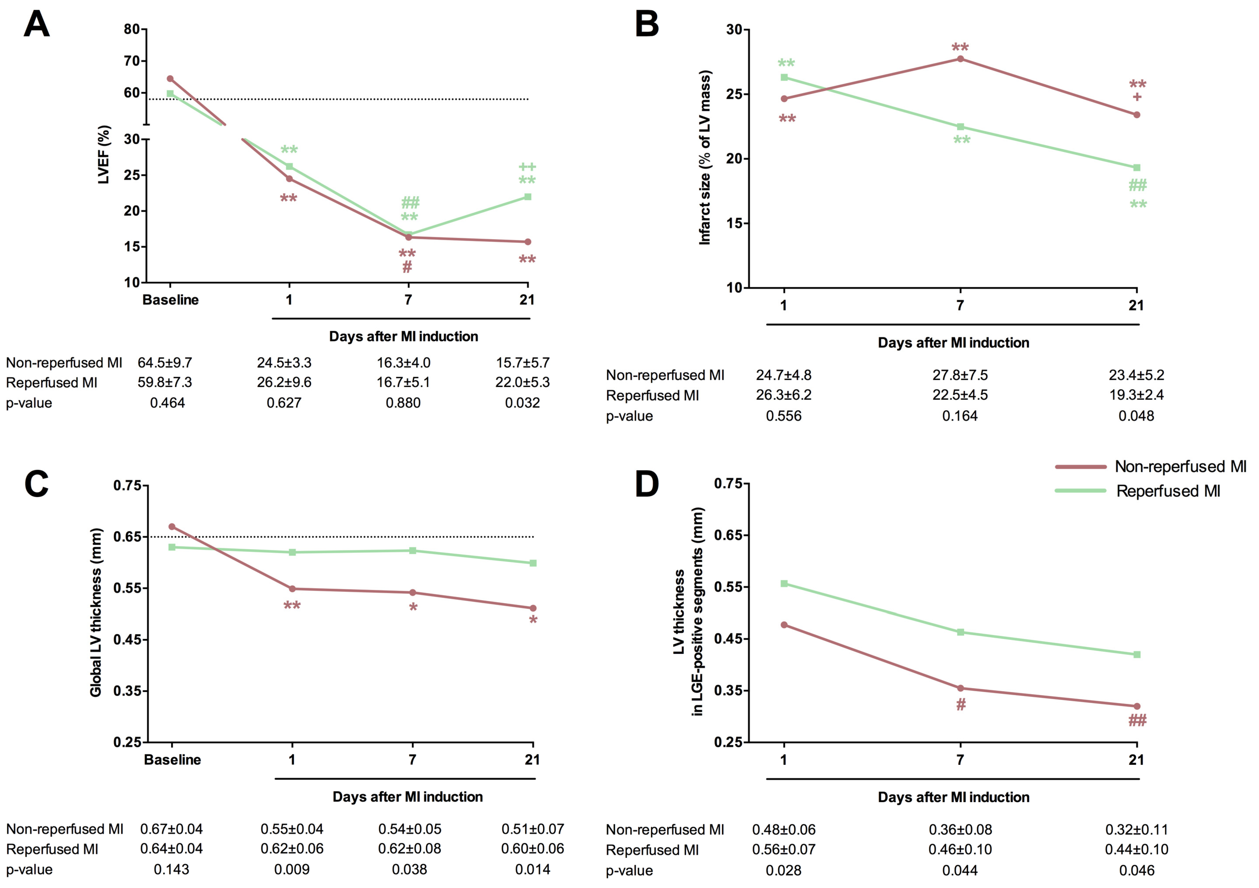 In our study, CMR identified early changes in contractile function (reduced LVEF) and myocardial tissue composition (LGE-positive segments) within hours after MI induction in both models. Mice subjected to transient ischemia exhibited larger LGE-defined infarcts and greater regional wall thickening, particularly in LGE-positive segments. Prior echocardiographic studies have shown that reperfusion after 60 min of ischemia results in pronounced reductions in LVEF and progressive LV dilatation, whereas 30 min of ischemia leads to only mild functional decline and no significant remodeling [