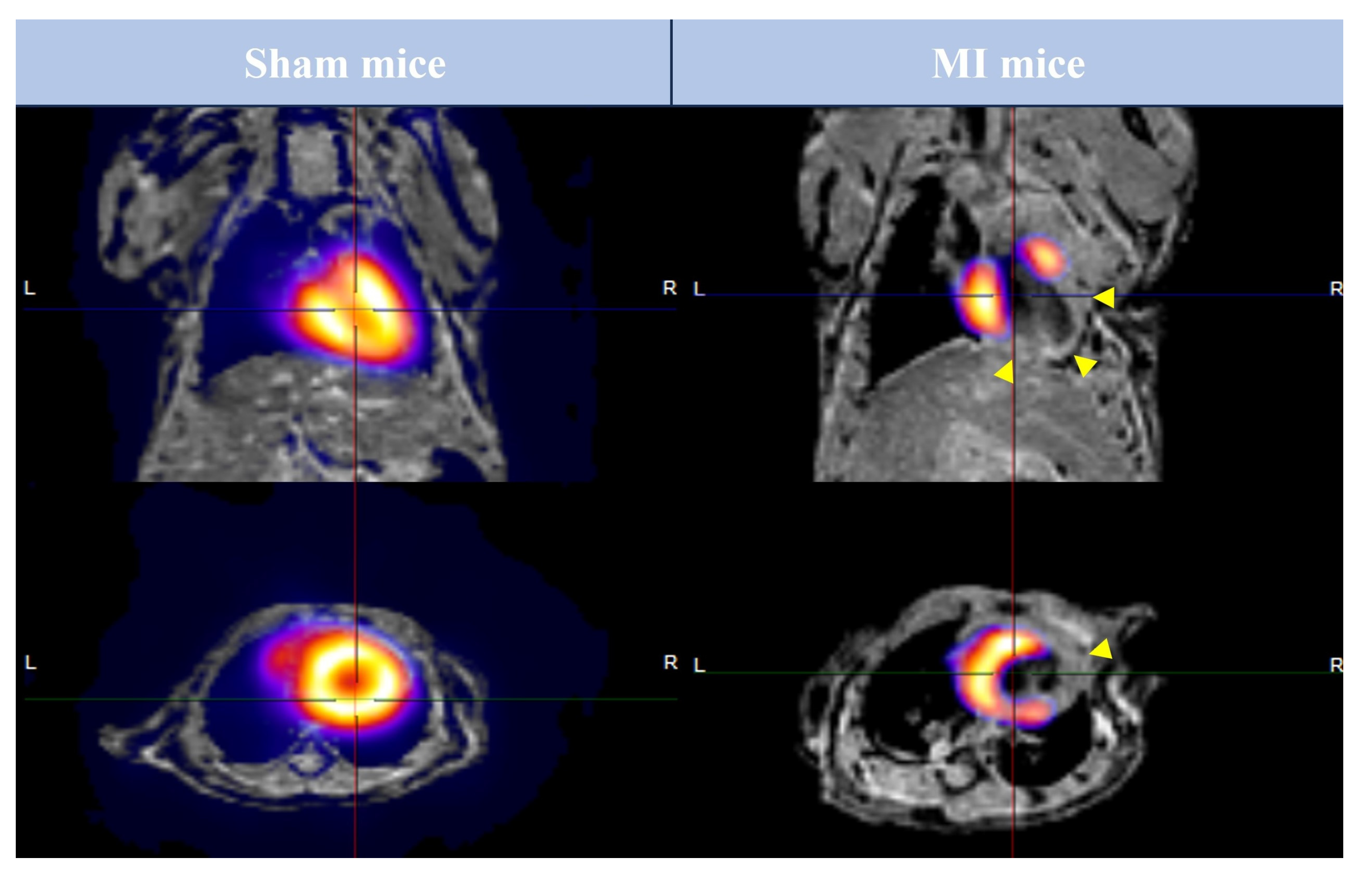 Mice (n = 26; 1:1 sex ratio) were randomly allocated to one of the following experimental groups: (i) sham; (ii) non-reperfused MI; (iii) reperfused MI. Randomization was stratified by sex and performed using a computer-generated sequence. Allocation was conducted by personnel not involved in procedures or analysis to ensure blinding. All investigators responsible for surgery, imaging, and data analysis were blinded to group assignment until study completion.