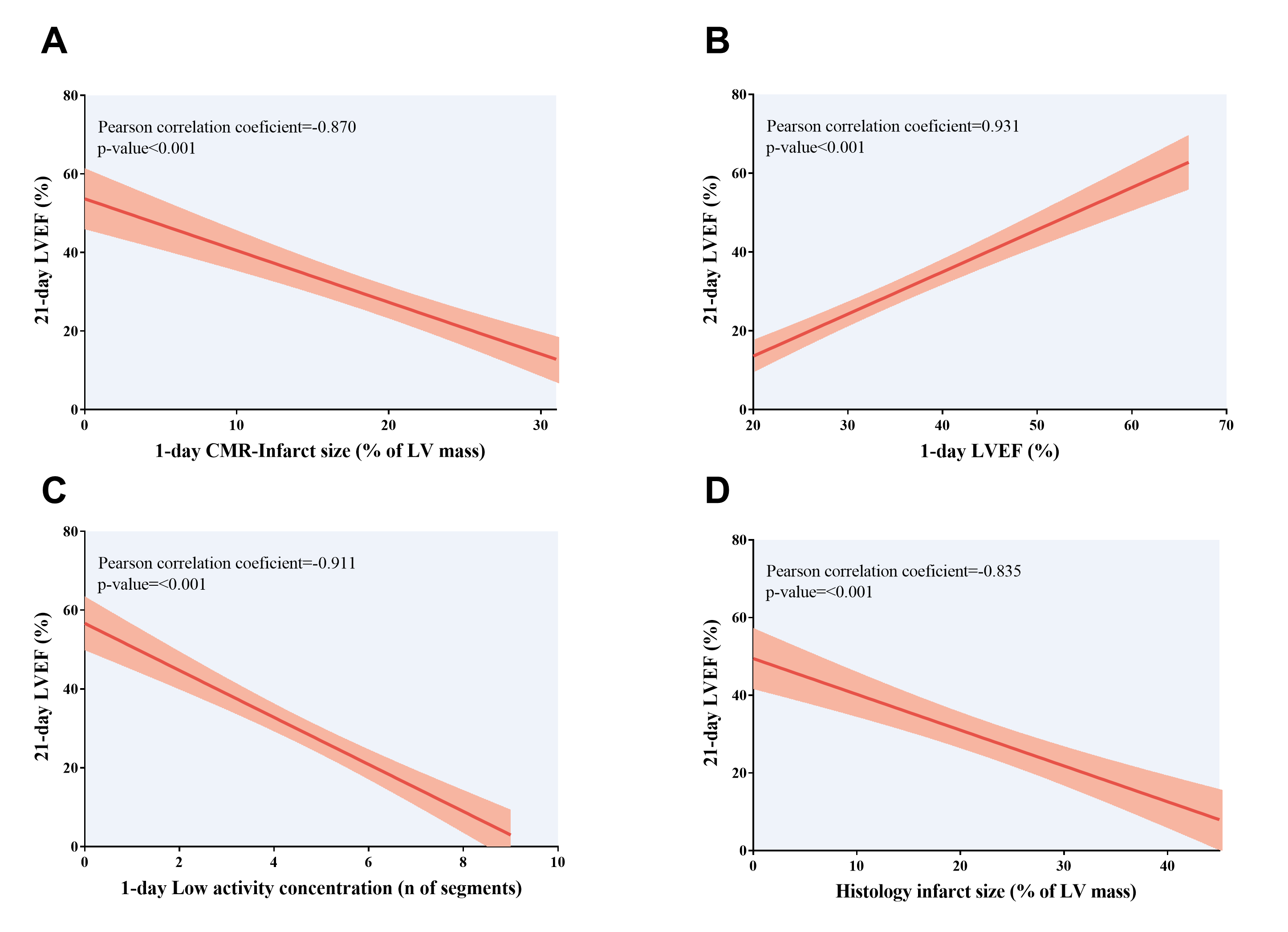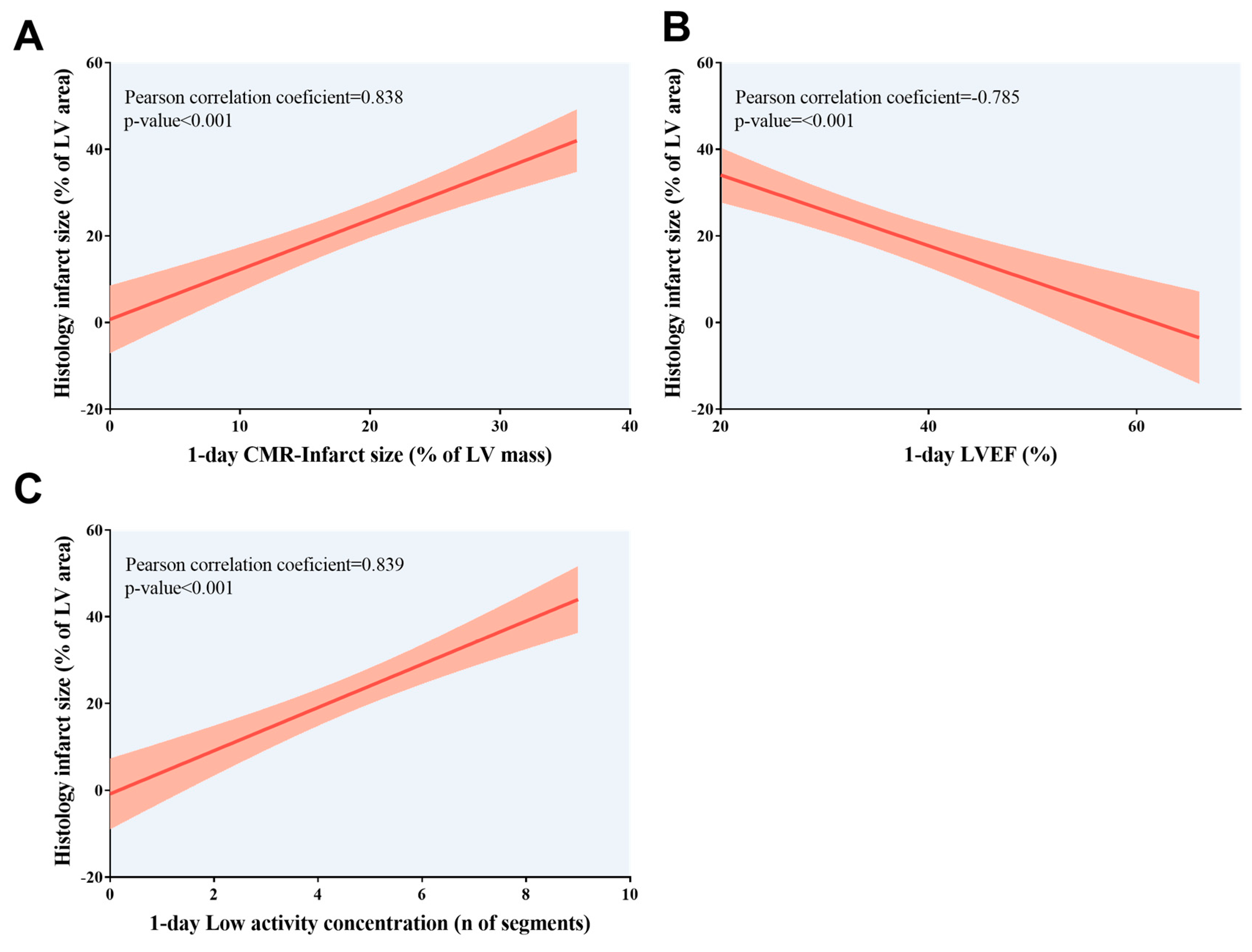 Spearman’s rank-order or Pearson correlation coefficients were used to assess associations between the main CMR, PET, and histological indices.